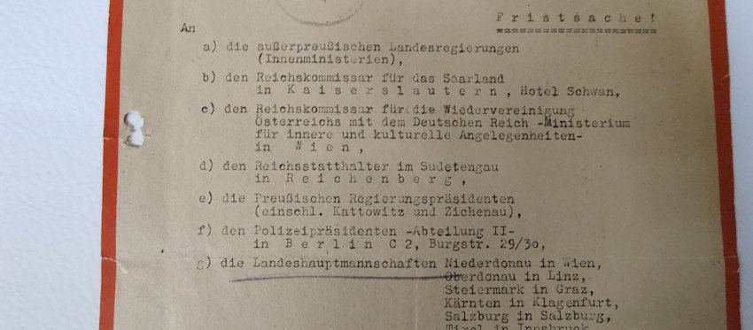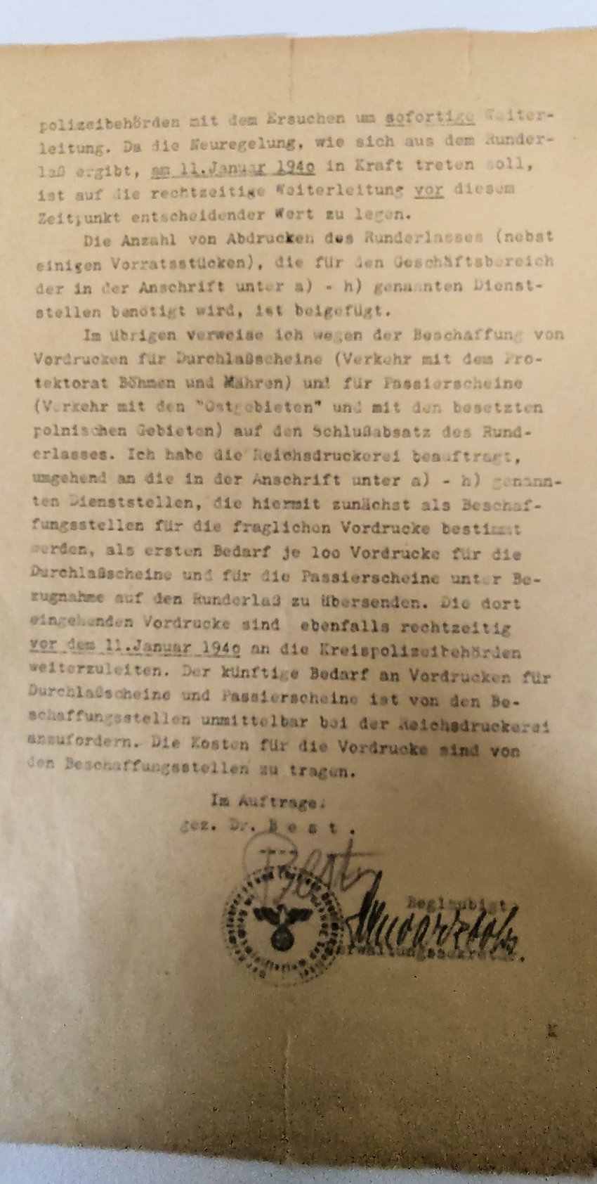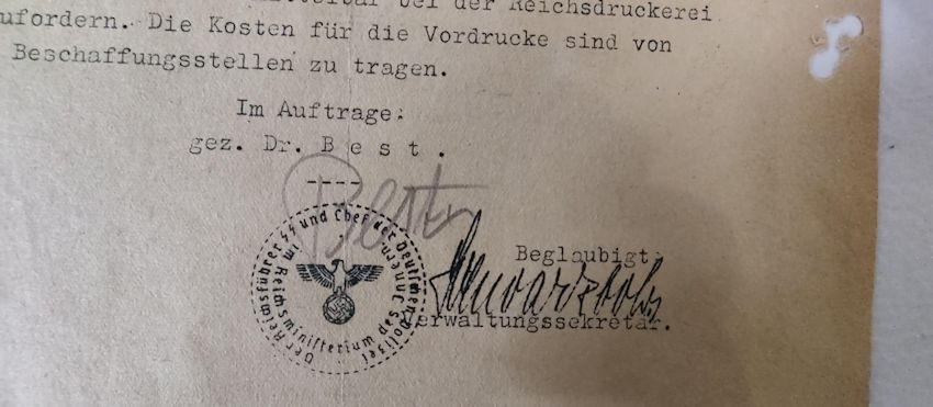 DESCRIPTION: This is a “Fristsache!” (deadline matter) in a “Schnellbrief” (urgent to circulate) regarding directives in the case of passports to be sent to several Austrian city ministries, offices, and Reich’s commissions that they seem concerned about, and is dated January 4, 1940. It has Himmler’s signature at the top left in his iconic green pencil. This has a dual historic attribute as it is signed by Dr. Best. This is the Dr. Karl Rudolf Best, SS-Obergruppenführer, Nazi Party Leader, First Chief of the Gestapo, and was the person who initiated a registry for all Jews in Germany to determine those with Communist affiliations. That it concerns passports is probably why Dr. Best is involved. The document is in perfect condition and is a prize to add to any collector of notable, historic signatures.
