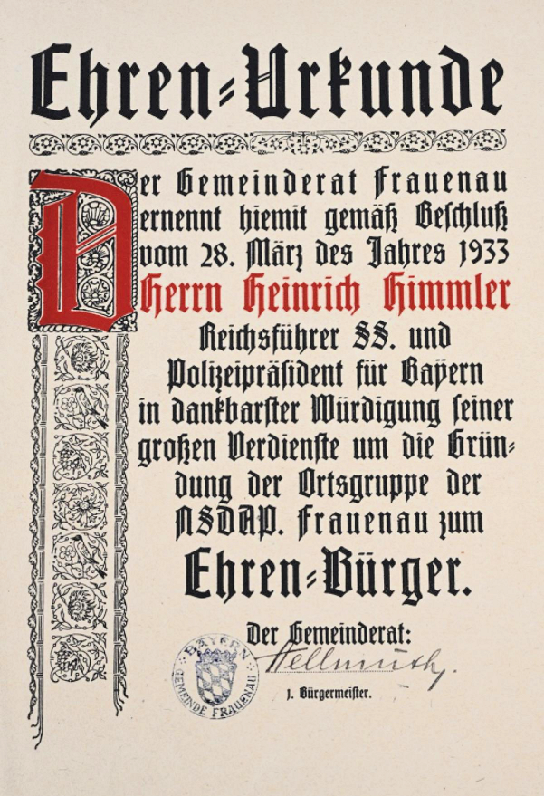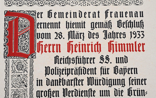 Honorary Citizenship Presented to Reichsführer Heinrich Himmler in Beautiful Calligraphy (Item HH 4-25) |
