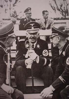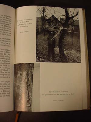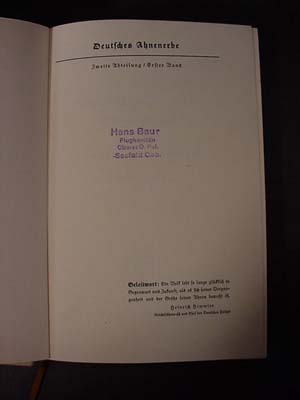 DESCRIPTION: This is wonderful! An SS Ahnenerbe book presented to the Fuhrer's personal pilot on Julfest 1939. The presentation wording is written in fine calligraphy probably by an Ahnenerbe artist and hand signed by the Reichsfuhrer SS Heinrich Himmler himself. This is a virtual treasure to the SS collector and the collector of Deutsches Ahnenerbe material. The inscription is SS Oberfuhrer Hans Baur zum Julfest 1937 Mit Den Besten Wünchen 22 12 1937 and the signature of the Reichsfuhrer SS to SS Oberfuhrer Hans Baur on Julfest (Christmas Week) 22nd Dec. 1937. An SS Oberfuhrer is equivalent to the Wehrmacht Oberstor (Lt. Colonel). Later, he was promoted to SS Standartenfuhrer (Full Colonel) and in 1944 he was elevated to SS Gruppenfuhrer (Major General). He was Adolf Hitler’s personal pilot and an author, plus SS Police official. He was a highly decorated WWI flyer and leading commercial aviator during the pioneer fledgling days of Lufthansa Airlines in the late twenties. Hitler became the first head of state to use air travel extensively. He personally selected Hans Baur to be the official pilot. “Luftwaffe One” was a reliable four engine condor aircraft which was plushed up and called “Immelmann II” after Max Immelmann a famous WWI pilot who was the creator of the famous dog fighting maneuver used during early combat between planes. Hitler increasingly relied on Baur for advice about air war policy and technical developments. At war’s end, he was trapped in the bunker with his beloved Fuhrer. Prior to being captured by the Russians, he was shot and his injuries were so severe that one of his legs had to be amputated. The Russians were deeply interested in Hans Baur, thinking he had flown Hitler to safety before the fall of Berlin. He endured ten years of tortuous questioning at the hands of Russian agents who finally released him in 1955. He returned to Germany to write his memoirs entitled “Hitler at My Side.” He died in Munich of strictly old age ailments and was interred in the family plot in the Westfridhof in Munich. He was a loyal SS man and even under horrid interrogations by the Reds, he never apologized for his faith and admiration of the Fuhrer. I met him in 1990 and while talking with him I held his little dachshund, Waldi, in my lap. To hear his exploits and look through his albums is a memory I will always cherish. He was a Teutonic Nobleman of the type we have not seen since or is it likely we will ever see again. Now he belongs to the ages! The book would be rare unto itself being one of the scarce books of the “Ahnenerbe” (the Foundation for the study of the Germanic past). You can read more about it in other Ahnenerbe entries on our pages. The book is named “Bauernbrauch Im Jahreslauf” (Customs of the Farmers over the Course of the Past). It is a 207 page text style book on this the occupation considered not only most worthy but particularly sacred by the NSDAP and especially the SS. In this monumental work by a researcher in the Ahnenerbe, Herr Hans Strobel, you will see the customs, and the traditions practiced down through the ages by the farmers covered in depth. Customs that seem strange to us today are shown and explained. Interesting ceremonies are detailed all having to do with pagan beliefs and ceremonies that would hopefully beget necessary good crops and animal harvest. Many of the reenactments seen in photographs were performed by SS Ahnenerbe functionaries. The typical houses in the book demonstrate writing and designs both Christian and Pagan. There are agriculturally inspired songs and poems and writings as well as explanations of the local customs of Bauern in all the German land – colorful maypoles, the flaming wheels, and the cultural importance of the pretzel and of oak trees is explained. Ancient talismans are studied; the Christmas and Yuletide legends are delved into in detail. Many ancient, important wood and stone carvings are illustrated in drawings. The Ahnenerbe researcher left no stone unturned while creating such a handbook dedicated to German agriculture and its honorable history. This aspect of the studies of the ancestry institute was the passion of Heinrich Himmler, SS Reichsfuhrer, and he personally indulged himself in it to a great degree. It seems quite natural in our estimation that he would choose copies of this book. For his personal choice of Julfest gifts to his closest friends and certainly Hans Baur would definitely be one of his very closest. The SS motto that was “Meine Ehre Heist Treue” (My Honor is Loyalty) was ever present in the mind of General der Luftwaffe and pilot extraordinaire, Hans Baur. The book measures 6 ½" x 9" and is a little over 1 inch thick. It has the original colorful dust cover and bears the personal stamp inside from Hans Baur Flugkapitan and Colonel of Police in Stefeld Oberbayern. On the forward leaf is a statement from Himmler that roughly translates to “A people will live so long in happiness in the present and in the future if they are conscious and aware of their past.” Very appropriate for this important volume I’d say! So, here we have a virtual 3rd Reich treasure and it’s not a field pack, nor a steel helmet, it is not a hand grenade or even a Knights Cross. No, it is my personal belief that this little book surpasses all the above in importance but perhaps I am prejudiced or just maybe historically knowledgeable and motivated in the way that I think. To me, this may be one of the most historically great relics we at Germania have ever offered. PRICE: SOLD |