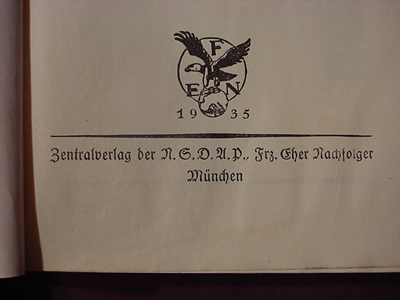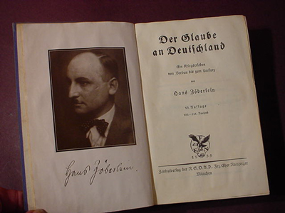 DESCRIPTION: The subtitle suggests that the author Hans Johst traveled throughout Germany chronicling the information about spying, deceit, and murder by secret society's and organized groups based upon racial solidarity. Hans Johst was a German playwright and N.S. poet laureate. As a juvenile he planned to become a missionary and when he was 17 years old he worked as an auxiliary in a Bethel Institution. He studied art, medicine and philosophy. He served in the army from 1914-1918. His early works were influenced by expressionism. He wrote many famous plays including "Der an Front" and "Der König" (The King) and later turned to naturalist philosophy in plays such as "The money changers and traders" 1923 and "Thomas Paine" (the American Colonial patriot). In 1928, Johst joined Alfred Rosenberg’s "Kampfbund for Deutscher Kultur" which was a militant league formed to preserve German culture and to combat Jewish influence in German culture. In 1932 he joined the NSDAP explaining his agreement with Hitler's ideology in the essay Standpunkt und Fortschritt (Stand and Progress -1933). The greatest of his plays was Schlageter! It was a heroic biography of the patriotic hero and martyr Albert Leo Schlageter and was first performed on Hitler's 48th birthday on April 20th, 1933, to commemorate his political victory. It was a beautiful play that brought out the heroism of patriotic young men in the desperate years and graphically illustrated the utter barbarity of the French tyrannical occupation of the German Nation. In 1933 Johst signed the Gelobnis Freuester Gefolgschaft, a declaration of Loyalty to Adolf Hitler that was expressed officially by pro N.S. writers; He became president of the German Writers Union and of the poetry academy. Johst achieved many other powerful positions of importance within the N.S. state. He was named in the ‘Gottbegnadeten’ list of September 1944 as one of the Reich’s most important artists. During the war he held various important positions within the SS and he was a very close friend and admirer of Reichsfuhrer SS Heinrich Himmler to whom he dedicated the book Maske und Gesicht. After the war Johst was interned by the Allies and in 1949 he was tried for his activities ("writing plays"). He served 3 ½ years in prison sentenced by the nations that claimed to protect and love free speech and freedom of expression. The hypocrisy of the Americans is especially noted because they reserved 1st amendment rights to their citizens (Some Citizens!) But denied those rights to a playwright and author named Hans Johst. Another writer, whose claim to fame was writing, was Julius Streicher and he was sent to the gallows where he slowly strangled to death for over 20 minutes after being condemned for his writings (no more, no less!) Hooray for Justice no matter how criminal it might be. The book is in very fine condition and has a very nice linen cover. In the opening page it says 'Für Heinrich Himmler in treuer Freundschaft.' (for Heinrich Himmler in true friendship). Johst must have been a very highly thought of friend of Himmler because he dedicated the book using only Himmler’s name and does not write out his title as Chief of the SS. This was always done by other writers dedicating books to the Reichsfuhrer. The book is very rare and is a true collectors find in this immaculate condition. PRICE: SOLD |