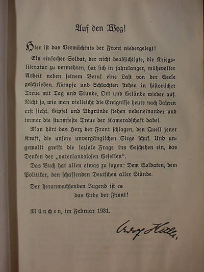 DESCRIPTION: This is the book in German entitled “Der Glaube and Deutschland” 1935 by Hans Zoberlein and printed in the central offices of the NSDAP in Munich. The subtitle is “Ein Kriegsleben von Verdun Bis Zum Umsturtz." Trans: The Belief in Germany, The war life experiences from Verdun to the Umsturz. Herr Zuberlein was a famed director in the 20’s and 30’s. The film Strosstrupp 1917 that was a smash hit was based on director Zoberlein’s own war memories. There was a film that was based on this book “Der Glaube an Deutschland”and it was financed by the National Socialist Government due to the influence of Reichsfuhrer SS Heinrich Himmler who loved the works of Zobelein. Adolf Hitler himself wrote the forward. The movie featured Wehrmacht and SA troops in its cast. The film was directed by the author of Der Glaube of course. The film was devastating. Realistic and thousands attended its premier showing. The book has 392 pages and has a blue linen cover that is not in the best of shape. The gold lettering of the title on the spine and the oak leaf motif that supports a WWI helmet is very faded but the book is holding well and is firm and tight. It is on the inside where we find the Himmler signature and a short presentation to an unknown ‘Sergeant”. It reads: “Dem Unterfeldwebel Harck Zugeeignet” (‘presented to Sgt. Haack”). We do not now who this Unterfeldwebel Haack was but in all probability he was a member of the Waffen SS. At first this terminology was used before the transition from Verfugungstruppe to Waffen SS and then the term became SS-Obersharfuhrer. There must have been some connection between the Reichsfuhrer and this Unknown Soldier (family?) (Family friend?). In any case the signature and presentation is absolutely genuine. PRICE: SOLD |