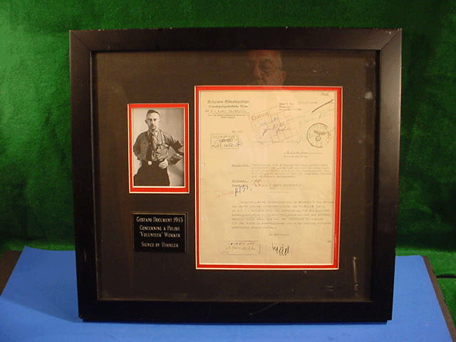 DESCRIPTION: This rare document came from a grouping of such directives that showed up in an official file folder recently in Germany. This one refers and give direction to the outside Prussian state governments and interior ministry and to the Reich’s commissioner in the Saar Land and a whole shopping list of officials. The order has to do with passport regulations that must be altered by hand. The major change has to do with the words “not applicable” that must be omitted in the paragraph dealing with these passports. There is a translation of the content that goes with the document. This translation was done by our historical advisor. The order emanates from the RFSS (Reichsführer-SS) and Chief of the German Police in the Interior Ministry. This, of course, was Heinrich Himmler and he signs the order in his usual green pencil over his stamp of office. The order is framed very professionally with museum matting that is 100 percent acid free; special glass was also used. The frame measures 22 1/2 x 18 inches. The actual document is 7 1/2 x 10 inches and the picture of the RFSS is 6 3/4 x 10 inches. Here is your chance to acquire an original important document hand signed by the Third Reich’s most important official and the most important policeman of the era.