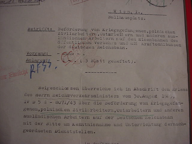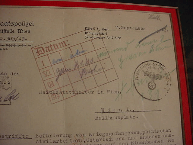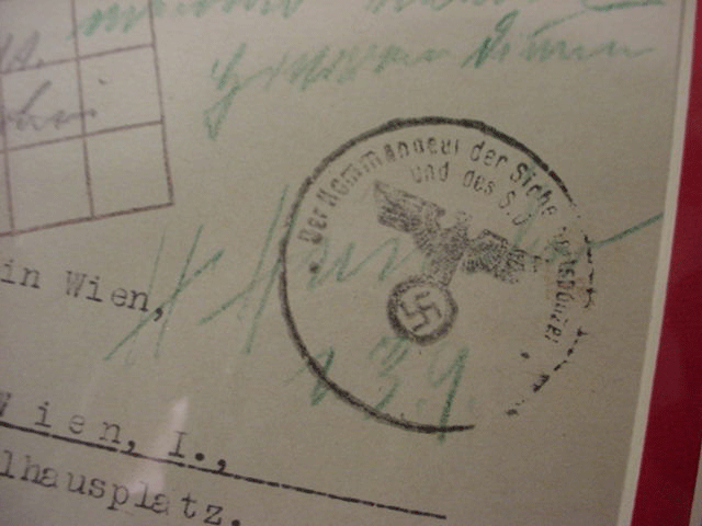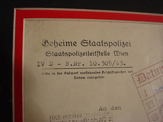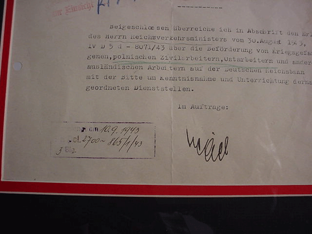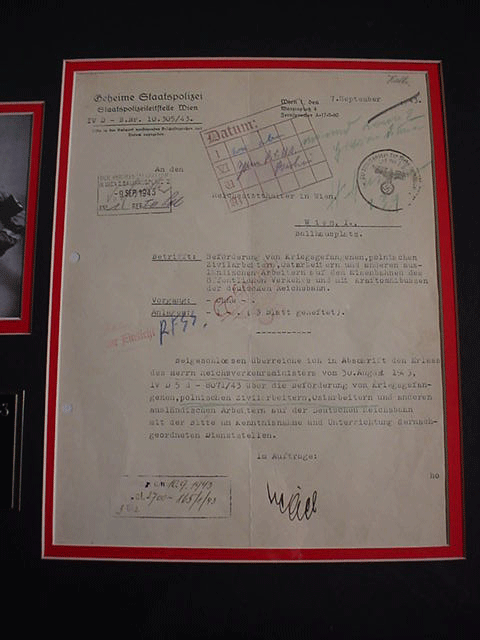 This is a document that concerns important issues about the use of Polish Civilian Workers who labored on projects of the German railroad system within and without the Reich. It originates in the office of the “Gestapo” Geheime Staatspolizei in Vienna and is sent to the attention of the Reichstadthlter in Vienna. It was dated 7 Sept 1943 and it had the approval of Reichsfuhrer SS Heinrich Himmler who signs his name in the usual green pencil as was customary for him. He signs it and then the stamp of Reichs security services (SS, Gestapo and SD) is made over the signature probably applied by Himmler himself. An important document and quite rare it shows also an official stamp that certifies that is was received at the Bauhauseplatz 9 Sept 1943.About in the center is a penciled note that reads RFSS and this indicates that this would need the Reichsfuhrer’s personal attention. Himmler was the complete dedicated bureaucrat and seldom did he leave even the most minute details of the important or semi important matters to his administrators alone. Not even Reinhard Heydrich was able to avoid his scrutiny in all governmental matters. So this is a good example of the SS Reichsfuhrers’ interventions in all official decisions. PRICE: SOLD |