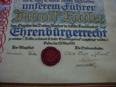 ![]() Adolf Hitler is presented an Ehrenbergerrecht from the city of Frankfurt in 1933 |