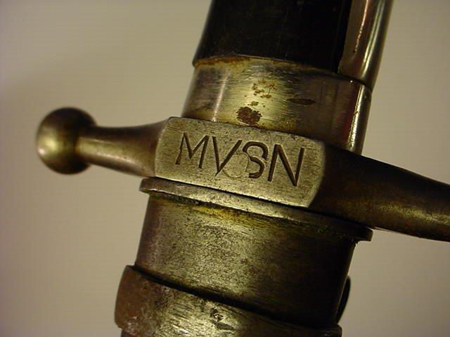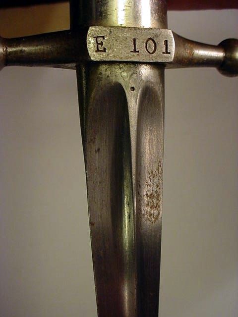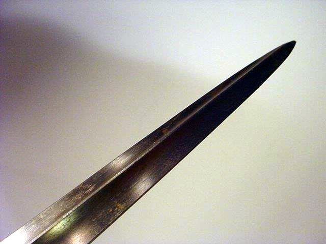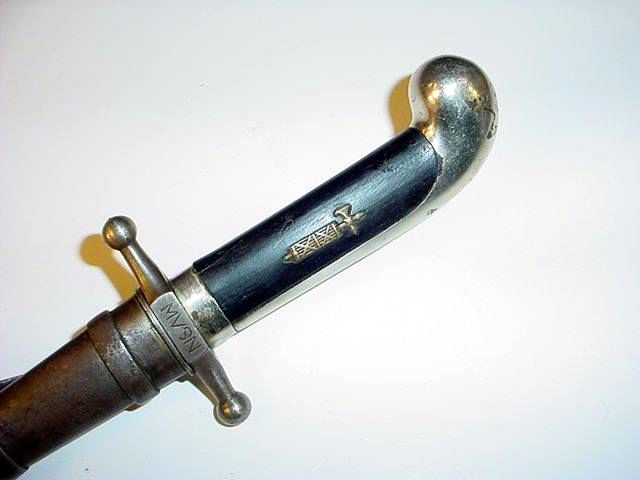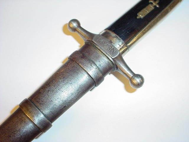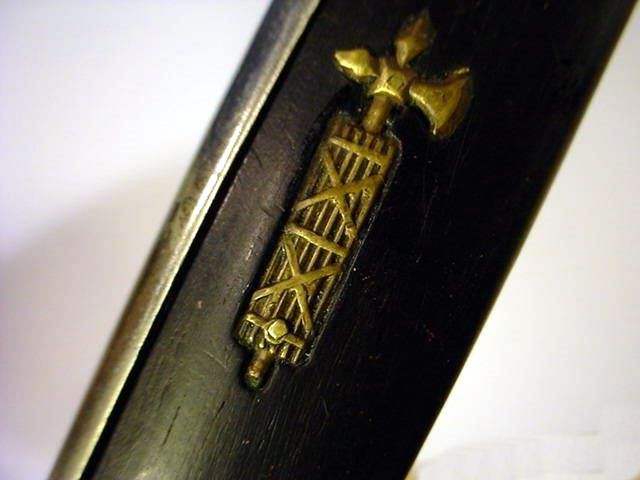 DESCRIPTION: This is a special version of the Fascist MVSN dagger that some of us have seen. This would have been the standard officer version with the double-chained hanger. These are also quite rare, but this one is seldom seen because it has a set of hangers in gold-bullion material. This was for very special occasions—possibly for diplomatic assistance. These daggers had almost spiritual significance to those who wore them. They were even used in the "Avanti" salute to comrades and allies. The MVSN in translation works out to "Volunteer Militia for National Security." The dagger itself measures a little over 13 inches and features a 7 3/4 inch, nickel-plated, steel blade (magnetic) with a sharp edge along the top of the blade (This feature is only found on these MVSN daggers). The blade is remaining bright and crisp with a sharp, pointed tip. The blade measures 368mm in length. The grip or handle is fabricated from aluminum designed with a quillion and complemented by black, synthetic plates. The obverse of the grips has a bronze Roman fasces insignia, while the pommel is fashioned in the form of an eagle's head accompanied by its black-painted metal scabbard (also magnetic) with dual dagger bands that are embedded into the scabbard's body with rings attached. The scabbard is 230mm in length. The Special Hanger Arrangement The luxurious straps or hangers are beautiful gold-trimmed material down the side straps while the center is Fascist grey—the color of Italian Government Service. They measure side by side thusly: The long one measures 10 inches long, while the short one is 8 inches long. At the top there is a belt-loop sleeve, that the straps are suspended from and this adds another three inches. The buckles are in bright brass as are the clips that hold the scabbard and the retaining clasp or hook. The hangers are in just about mint condition and quite beautiful. These dagger accoutrements are exceptional and certainly extremely rare! PRICE: $1,750.00 |