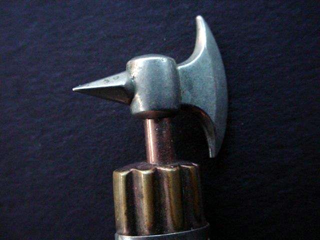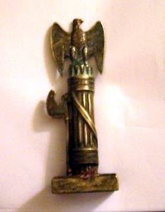 DESCRIPTION: This is a completely unique relic of Fascist Italy. It is a sword completely made out of marble and rock crystal -- the sword is in the shape of a Roman Empire weapon known as the “Gladius” in Latin, also known as the "sword that conquered the world." A reference to the might and power of the Roman Empire, Benito Mussolini the strong man of the 1920’s to the mid 1940’s wanted to revitalize modern Italy but he wanted at the same time to bring back the days of heroism and military splendor. His famous words are remembered “Better to live one day as a lion than 100 years as a sheep,” is nearly forgotten as the men of the earth sink deeper into liberalism and intellectual slavery to non-heroic ideals fit for sheeple. Well, enough of that for now. The sword is an artistic creation handmade in the city of Carrara. This city is in the province of Massa Carrara (Tuscany) and is famous for the various types of marble quarried there. It is 100 km. west-northwest of Florence. Settlements in the area are known since the 9th century, B.C. The current town originated from the Borough built to house workers in the marble quarries created by the Romans after their conquest of Lingulia in the early 2nd century, BC. At one time it was a hotbed of leftist and Communist activity but along came the “Duce” and most of the quarry workers after hearing him speak became dedicated Fascists because they saw greater benefits in the Fascist programs for the workers. It seems the trade council of Carrara at some point in the 30’s, decided to make a small gift to the Fascist leader and it was decided that a Roman Gladius was the appropriate present to the greatest Roman of all. It of course must be made of marble coming from this renowned ‘City of Stone’ so it was decided that such a Gladius must be constructed from all the various types of marble and crystal that has been quarried there. If you look at the pictures, you can see that this was indeed accomplished in the beautiful artistic presentation employing some different types of Carrara marble. The grip is in wonderful grained yellow-brown stone while the cross guard is in the finest grade pink marble. The blade is of the same Carrara marble that was used in the Roman baths and in fact later it adorned the German Reich’s Chancellery wall and floors. The finial or top is formed in mine cut crystal as are the ends of the cross guard. Rarely when marble is mined such perfect pieces of crystal show up and they are professionably cut much the same as a rough diamond is handled. On one side of the cross guard is the large (M) in silver (Mussolini), on the other side is the Fascist eagle (Aquila). The piece is 21 inches long and 7 inches at the widest point of the blade. A thing of beauty to behold and an extremely prodigious relic of great importance to history of a turbulent time. We received this sword directly from an old veteran of the 7th Army who accepted the surrender of it from an Italian partisan who claimed he took it from some sort of Fascist HQ in the town of Varnando de Costa near the village of Predappio. This was the place where the Duce was born July 29th 1883. We assume that after Mussolini received the sword he presented it to the HQ there that maintained a small museum dedicated to their leader where other valued Fascist relics were kept in reverence and pride. Like so many veterans insist when selling us their relics we are not at liberty to disclose his name. This is at the insistence of his family (he is now deceased). Please note: The sword is all there but due to the ravages of war there were several cracks and breaks in it as you can discern from our pictures. So, it is extremely fragile but holding up well. Remember, this is a rare object d’art but also it is probably the greatest Fascist item ever to surface on the net. It should really be in a museum, maybe in Rome, Georgia! PRICE: $11,000.00; Special Sale:temporarily reduced To $4,000.00 |