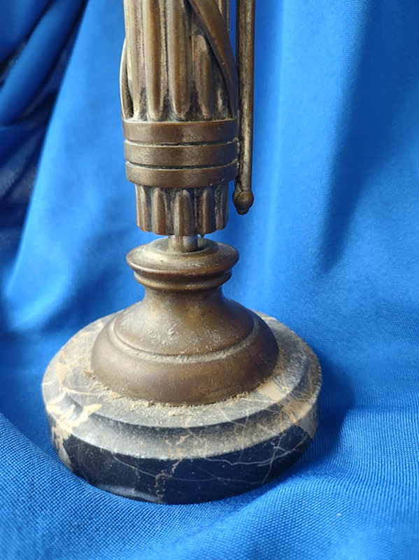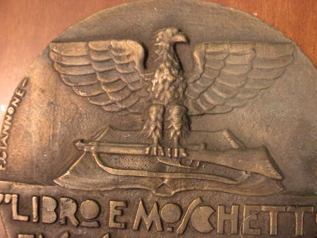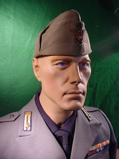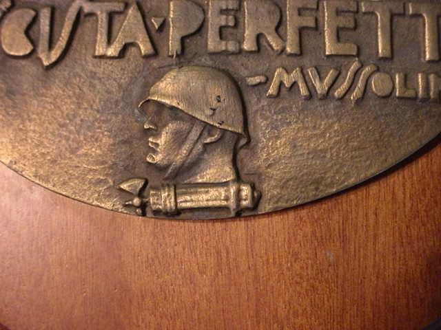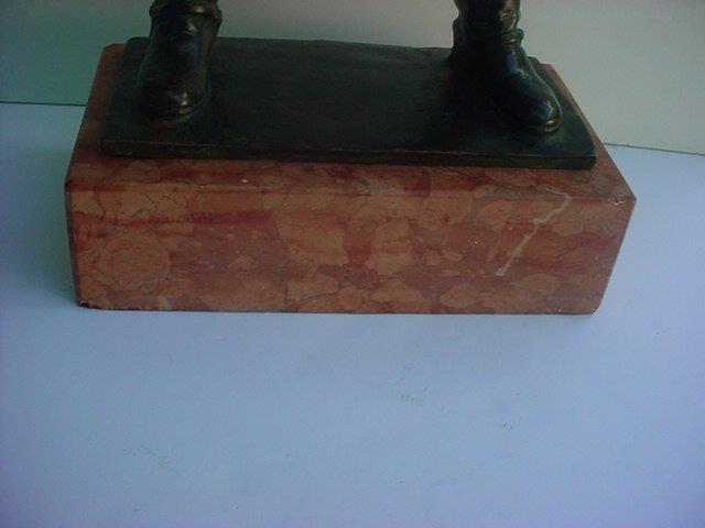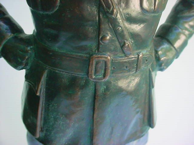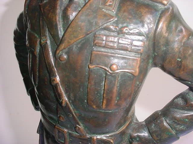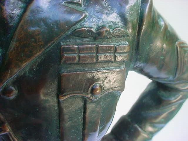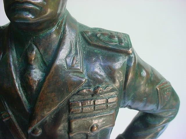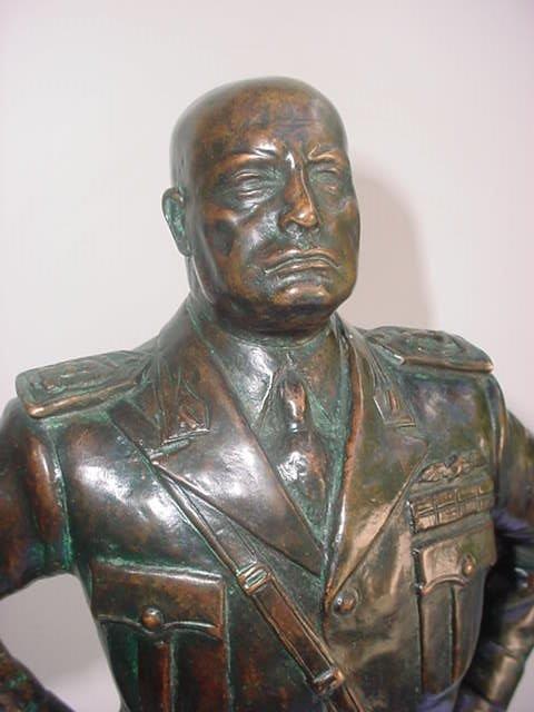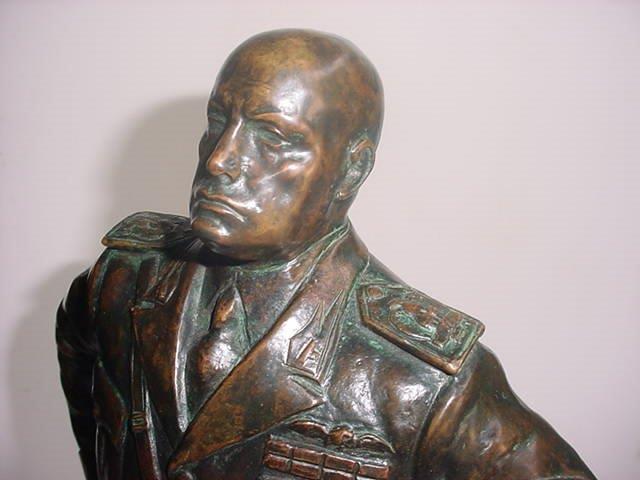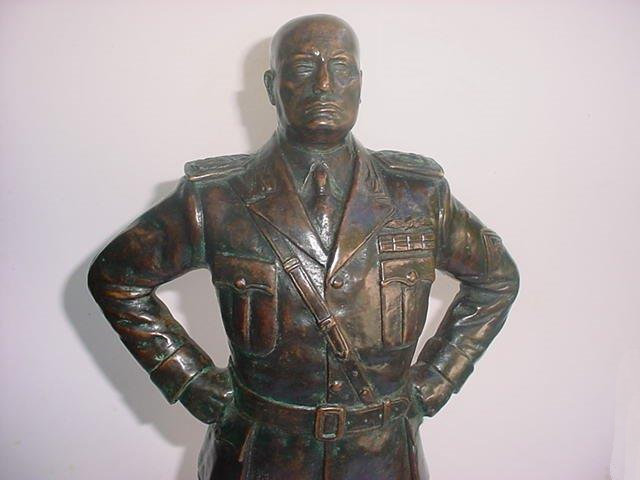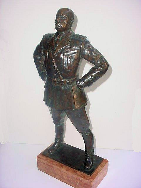 The Bronze Statue The sculpture is in solid bronze and stands 20 inches high and measures 9½ inches wide from elbow to elbow. The sculpture weighs 25 pounds. It 's mounted on a slab of beautiful Italian marble (what else?). The figure shows the ribbons and medals, and the flyer's badge. The patches and epaulettes that are seen are indicative of his special office of Il Duce (Supreme Fascist Leader). If there is another one of these in a private collection or in a museum anywhere, we would like to hear of it because we know where this one has been for the past 40-50 years. It is a very special art object and a museum worthy of possession; a one-of-a-kind treasure—extraordinaire!!! PRICE: $5,500.00