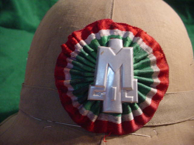 DESCRIPTION: This tropical pith helmet was similar to the ones used by the Bersaglieri in North Africa. The GIL Youth Organization sent volunteers to assist with military matters in Africa. The GIL stood for Gioventù Italiana Del Littorio (or Italian Youth of the Lictors). The helmet bears the symbol of the GIL and it is mounted on a rosette of the national Italian colors. Fine condition! Marked with a ‘size 54’ inside. It has a pocket on the right side and this could be for the wearing of feathers just like the Bersaglieri did for certain Gala occasions. A very nice and rare WWII relic.