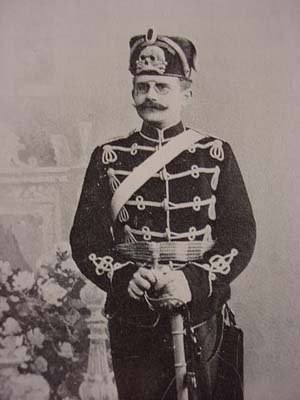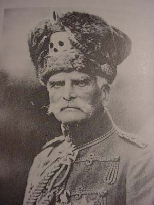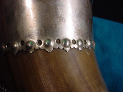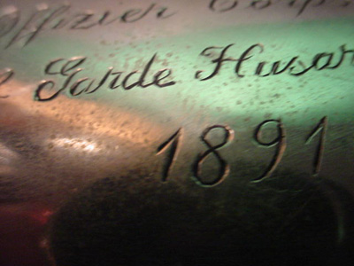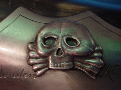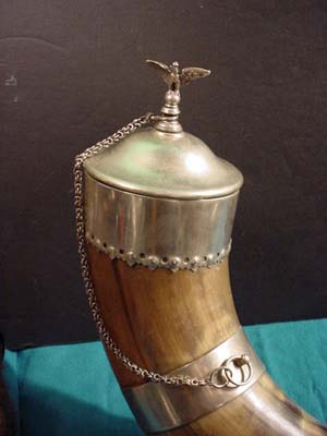 DESCRIPTION: This huge steer horn was presented to Graf von Schlieffen (1833- 1913). This type of steer horn was often a special gift that was presented to retiring officers, famous or important personages, etc. by the admirers or regimental command to officers they wished to honor. This is obviously the case here. It certainly is one of the most historically important relics of Germanic past military glories that we have ever acquired. A silver plate affixed to the body of the horn has the skull emblem of the Leib Hussars (Heavy Cavalry) affixed to it and underneath the leering skull are the words: “Dem Scheidenden Kameraden P.L. Gr. Von Schlieffen Das Offizier Corps Des Leib Grade Hussaren Regt 1891". Translation – The Grateful Comrades of the Prussian Life Guard to Graf (Count) Von Schlieffen from the Officer Corp of the Body Guard Hussar Regiment 1891. It was a common practice for such presents to be awarded to retiring commanders but in this case this horn was given to Von Schlieffen in 1891 when he was made the supreme commander of the army and chief of the German General Staff. We believe he transferred from his first posting in the Prussian Leib Grenadier Regiment to the Life Guard Hussars along with his promotion. Before this he had participation in the Austro-Prussian war in 1866 and in the Franco-Prussian war of 1870-1871 while on the General staff as a Fieldmarshal and strategist personified! Schlieffen was born in Berlin in February 1833, the son of a Prussian army officer. He entered the army in 1854 at the age of 21 quickly moving to the general staff, he participated in the Austro-Prussian War in 1866 and in the Franco-Prussian War of 1870-71. In 1884 Schlieffen became head of the military history section of the general staff, replacing Count von Waldersee as chief of the German General Staff in 1891, after thirty-eight years of military service. In 1905 von Schlieffen presented the Schlieffen Plan. This plan would prevent Germany from fighting a two front war, by first defeating France in a lightning campaign and then throwing its full weight against Russia. The rest of Schlieffen’s career was spent inculcating the operational ideas required to make this strategy work. He retired on January 1, 1905 after nearly fifty-three years of service and died on January 4, 1913, just nineteen months before the outbreak of the First World War. It is believed by many that the Schlieffen Plan would have proven itself successful were it not for the diminishing of the right wing by Schlieffen’s successor, Helmuth von Moltke the Younger’s influence. Although some criticized him for his “narrow-minded military scholasticism” Schlieffen was perhaps the best known contemporary strategist of his time. Schlieffen’s operational theories were to have a profound impact on the development of maneuvers in warfare in the twentieth century, largely through his seminal treatise. His theories were studied exhaustingly, especially in the higher army academies of the United States and Europe after World War II. American military thinkers thought so highly of him that his principal literary legacy, “Cannae,” was translated at Fort Leavenworth and distributed at a nominal charge within the U.S. Army and to the academic community. General Erich Ludendorff, a disciple of Schlieffen who applied his teaching of encirclement in the Battle of Tannenberg, once famously christened Schlieffen as “one of the greatest soldiers ever." Long after his death, the German General Staff officers of the Weimar period and World War II period, particualry General Hans von Seeckt, recognized an intellectual debt to Schlieffen theories during the development of the Blitzkrieg doctrine. The steer horn is huge measuring about 35 inches long including the silvered metal cap at the end. The cap is form fitted to the horn with a removable lid which has at its top the Prussian Eagle wearing the Hohenzollern Crown. A chain is attached that ties to a band about 4 inches lower than the cap. The shield with skull and presentation wording is about 5.x4 in measurement. Down toward the horn’s point is another ring attached to another silvered band. The skull depicted is definitely of the Leib Hussar shape and looks unlike other skulls used by WWI shock troops and later Freikorps and SS personell. The back of the horn has a devise like a table leg in metal that is positioned perfectly so that the horn stands as it should without chance of tipping over. This relic is quite beautiful looking but is also prodigiously important historically. It should be included in a prestigious museum display or in a notable collection. It stands as a silent memorial to the greatest tactician of modern warfare the world has ever known. PRICE: SOLD |