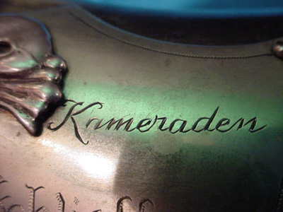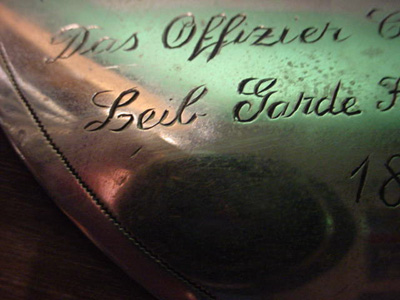 DESCRIPTION: It can truly be said that Germania International has over the years turned up and offered the greatest and most historically important Germanic articles than any other site in the cyber world. Now, we have outdone ourselves with the greatest find ever! So important that almost anything offered on other sites rather pales in significance. Bragging? Well, YES, we are bragging for, other than the Kaiser Reich throne that we feature, this has to be the Cr�me de la Cr�me! If the German government had its pride back this would be one of the most highly sought-after relics of the grand age of the Kaisers ever discovered�it would be featured in a secure, illuminated glass showcase�in a secure Chamber of the Deutsches Historisches Museum on the Unter den Linden and proudly displayed where German people could view it and reflect on the days of grandeur and refinement; the age of Imperial Majesty. This is the guest book of the Gardes de Corps with signatures all the way from 1904 to 1921. The Gardes du Corps was first established in 1740 by Emperor Frederick II (The Great) as a personal bodyguard to the King of Prussia. They were always considered (The elite of the elite!) Frederick Blumenthal was the first commander. The guest book contains almost 1,000 signatures and was signed by persons who either visited the Potsdam Garrison of the G.D.C. or by persons seeking an audience with Kaiser Wilhelm II, or the empress. Practically every single name in the book has some sort of history that would be in the annals of the German nation�s glorious history of distinguished guests. Am I revealing my identification as an incurable romantic and consummate Germanophile? Notable dignitaries that are found on the many pages are for instance, ambassadors, consuls, generals, professors, and officers of various regiments. Some of the names seen were well-known illuminaries in WW II; for instance, Adolf von Beckendorf, Hasso von Manteuffel, von Reppard, von Hohenau, von Prittwize, Hermann Kiefier, Lettow Vorbeck, Chanceller von bullow, von Papen, von Felgenhauer Kleemann, just to name a few. Also, most WW I zeppelin commanders, division commanders, and other well-known personages from political circles and aristocratic nobility are included. In addition, many countesses and Freifrauen visited the Gardes du Corps; chief surgeons, and Reich music directors, professors in high academic standing, and state ministers are amongst the guest list. It would take numerous months for a genealogist or academically trained professional historian to investigate each and every person who signed this fantastic book. It reads like the ultimate who�s who of German greats. Herr Wilhelm Reinhard Gehlen, our translator, and historical advisor and a very astute researcher studied this spectacular book for several months and did a superlative job of researching the various signatures. He put together over 100 typed pages that identify many of the signatures. When one actually takes the time to absorb what is seen in the two three-ring binders that he produced you can only be swept off your feet when the importance of this collection sinks in. We cannot find the words to fully describe just how prodigiously pertinent this is to Germany�s history. That this volume manifests and brings forth the importance is obvious and the sheer beauty of the book and its case is abundantly compelling. The cassette that encases the precious book measures 12 x 17 inches and is about 1 � inches thick. The case is covered in rich, deep maroon velvet fabric and its corners have beautiful brass supports in rich 1880�s design motif. In the center is an actual Prussian Gardes du Corp officer�s helmet plate with the gorgeous black Prussian eagle in enamel that is plated over a white enameled circular background that has the motto �Suum Cuique� (To each his own). This helmet plate represented the star of the Prussian Black Eagle Order and in its arms you see the statement �Mit Gott f�r K�nig und Vaterland 1866.� When the brass catch is opened and the cover lifted there inside a fitted indentation you can see the cover of the simple leather-covered guestbook with the words embossed in gold � G�stebuch Regiment der Gardes du Corps.� At the underside of the velvet case are four small brass squares and these are the feet that support the precious book as it would lie on the table in the entrance to the G.D.C. area that one would enter before actually being escorted to the great hall of guards or the passageway to the Hohenzollern Palace. But no matter how important the person might be, they must have passed through the Gardes du Corps security station and signed the guestbook. Besides all the famous German luminaries that signed the book there are many foreign dignitaries as well; many Russians, Swedes, French, and Danish ambassadors as well as English and Japanese VIP�s and more. I could go on all day about the beauty and great importance of this wondrous item, but this certainly will more than thrill the imagination of those of my readers who are the �Kulturtragers� among us. It is certainly not for those considered who unfortunately are termed Belanglose! What really could compare? An entire book could be written that contains and explains only part of the importance of the various signatures seen here. We offer this spectacular item at a price that seems almost ludicrously reasonable in the hopes that it will eventually find its way to a German official state archive or a museum collection. Germania offers it with the wish that it returns to the Vaterland in dignity and to be cherished in the manner it obviously deserves as a national treasure of the Reich. PRICE: SOLD |
