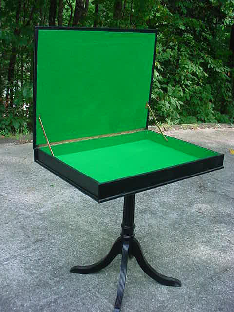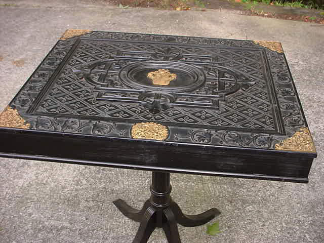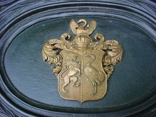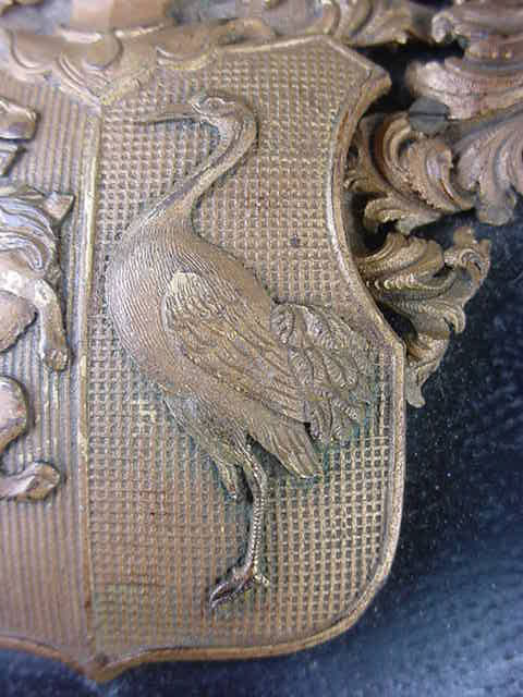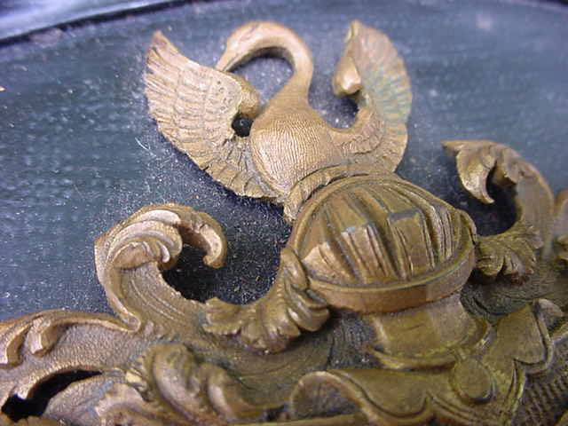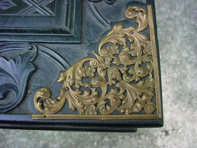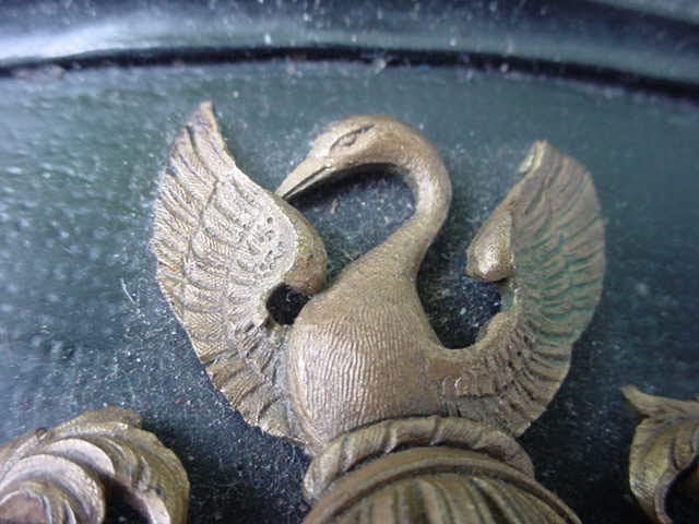 DESCRIPTION:This is a beautiful display table that is reputed to have come from a stately house in Füssen near the famous Ludwig Castle (Neuschwanstein). The meaning of the word is “New Swan Mountain”. (Swan) – this was the symbol of King Ludwig and his “Totem”or fettish in lieu of better words. Practically everything he had had a swan as its major or minor theme. Paintings, wall frescos, porcelains, even his boat was shaped and painted to look like a swan. Even in his many guest houses in the close proximity to his castle the eternally prevalent swan is perceived. Ludwig II born August 25, 1845 was King of Bavaria from 1864 to 1886; the year of his death,( mysterious death!) (probably murder). He is often referred to as the Swan King in English and the Märchenkönig (“the fairy tale king” in German). Ludwig is also referred to as “Mad King Ludwig” though the accuracy of that label has been disputed. He was best known as a rather eccentric monarch whose legacy is intertwined with the history of art and architecture, He commissioned the construction of several extravagant fantasy castles. The most famous being Neuschwanstein. He was a devoted patron of the greatest German composer, Richard Wagner and much of the designs inside the castle are dedicated to him and his great operas that Ludwig (and I) loved and adored. The legend goes that one of these beautiful tables was to be found in the corner of certain rooms set aside for the most honored guests. This guest would be instructed to open the top of the case and be surprised ! Inside was usually an elaborate gift from the king which could be a miniature painting of the king himself or in many cases a copy of Ludwig’s personal finger ring. The table was looted by a member of the 82nd Airborne. He will not agree to the publication of his name (understandable). The table is still in his possession. He calls it the spoils of war.- - - I would call it theft but in any case it is legal to sell. in this country The story about the use of the table comes from a lady who worked at this house before the tragic end of the war. It was she who gave it to the GI in exchange for some food and cigarettes. She knows all about it. Although the tradition died with the death of the king. The display case stands on a table leg appendage with 4 legs. This might have been added years ago? With this the case and stand measure 31 inches high. This case is 30 x 24 inches across and is 4 inches deep. The top is either hand carved wood or molded gutta-percha as used in Dagguereotype photo types in the 1800’s. This was introduced to the Western World in 1843. It looks so much like wood that it is hard to tell the difference without taking out a chip and that we will not do. The entire top is covered in floral and geometric design typical of the 1870-1880’s. In the center of the design is a brass coat of arms that says Ludwig (all the way!). It is a crest with the Lion symbol of the Kingdom of Bavaria facing the swan of the house of Ludwig II.At the top surmounting a knights helmet is once more the swan symbol. The corners are brass designs employing again floral 19th century typical designing. There is one of these also at the center bottom. When the top of the case is opened you can see a green felt covering top and bottom. This is not the original material. The wife of the looter told our agent that this once was a printed design inside with swans as the motif in the top portion. But it was in terrible condition with age old mold so she recovered it. She did a good job but I wish she left it alone. This is a very special offering, and if you ever wanted to own a genuine piece of royalty this is your chance. Not only gorgeous but prodigiously important historically as well. Ludwig may have been called “Mad” but his artistic sense and superb aplomb shall be admired for all time. His imperturbable passion for the higher arts is now legend!