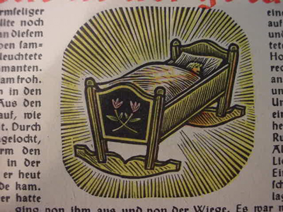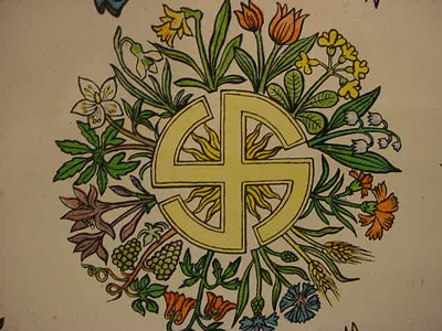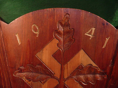 Now back to the cradle. This is not the complete cradle; it is only the important piece -- the foot of the child’s bed. This part was ordered to be made by a local village carpenter who was also a fairly good wood carver. The deep meaning is there for all to see. It was decorated with the theme of the National Socialist mythos and it was hoped that the symbolism might make a mystic and powerful totem that would transcend the usual mundane humanism and give glory to Nordic heritage and Aryan beginnings. This cradle board was produced in 1941. So the child, if still alive, would today be 68 years old. Lets hope he made it through al the bombing of the German cities and the massacre of German men, women and children in 1945 when the “gentle” Russian Allies began their devil dance of murder and mayhem throughout Europa. The theme of the decoration is the sprout of the young oak tree growing and being nurtured to the future when it would be a giant sturdy oak. The oak tree was sacred to the ancient Teutons and to the NS culture as well as the symbol of strength and nature’s beauty. The Hackenkreutz (Swastika) behind it symbolizes the spirit of the N.S. mythos that is tightly tied to the oak in meaning and presence. The message is quite clear that these parents were loyal Party members and wished that their child would also be imbibed with the spirit of the Party and loyalty to his Germany in his/her life. This is true NS culture. We speak from a historian’s viewpoint. This NS item is full of deeper meaning than any pair of Wehrmacht jackboots or an SA dagger. Unlike these rather usual and mundane objects or collectibles; this piece talks to us -- it is possibly the only remnant of the life of a Bewegungskinder “a child of the movement.” The piece measures about 32" wide and about 35" high for the educated collector of important NS cultural items, this is an incredible find.