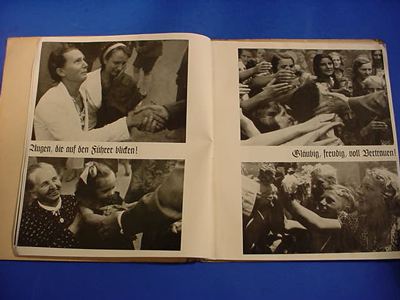 DESCRIPTION: Here are 93 or so leaders covered including Hitler, Goring, Goebbels, Himmler, Frank Von Schirach, Raeder, Frick, Telshow, and a bevy of other officials of Party and Wehrmacht. Measures 10" x 7" and is in remarkable condition except that a small section of the back cover is missing. This is a very rare item and worthy of a great book collection.