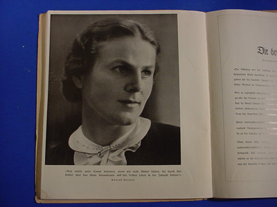 In his famous book, the infamous leftist correspondent and “yellow rag” author, William L. Shirer, says in “Berlin Diary” that he was struck by the ugliness of the German women in the streets. Ugly, he actually said UGLY! He also said at another point that he was struck again but the ugliness of the German army helmet. Shirer said that German women “had no ankles” -- that of course was blatant bigotry. Screams of racism would be heard world wide if Michelle Obama was said to have thick native African lips. But to insult German women who lived in the period of the Third Reich is more than acceptable, it is almost expected in this politically correct world. Defamation can only be used against Muslims and Germans, that is “Populist” Germans! Anyway, this book whose title translates to the “Countenance of the German Woman” in my estimation is the epitome of the National Socialist agenda in pictures. The adoration and respect accorded to the women of the Reich surpasses all other nations now and back then. German women were never drafted to do labor in the factories during the war as British and Soviet women were. Frau Emmy Goring, Frau Magda Goebbels, Leni Riefenstahl, Gertrud Scholtz Klink and Frau Inge Ley, wife of Labor Leader Robert Ley, Winifred Wagner, and Frau Gerdy Troost personified the spirit and dedication of the German female. Beautiful yet dignified and dedicated to the cause they perceived as right for Germany and right for Europe.