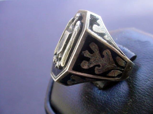 DESCRIPTION:This is the naval version of the victory ring series. This is one more of the rings that we were so fortunate to be able to buy from a hidden horde of jewelry that was all produced in silver by a master silversmith. This purchase was accomplished at great cost at the Stuttgart Waffen Borse a few years back. Please go to our home page and see the history of this great purchase. Titled “About our Rings and Silver Insignia”. In our entire long careers in this field we had never envisioned let along experienced such an experience. This was the “Aladdin’s Cave” of military and N.S. treasures. We had to as we have noted buy “everything” that was brought in but luckily we were able to sell all the non military items at one time locally in Stuttgart leaving us with multitudes of military and N.S. political pieces. The greatest of all the pieces designed and produced were the “Victory Rings”. We knew at first sight that these would be treasured by collectors due not only to their brilliant beauty but to their importance to the history of the German Wehrmacht (armed forces). With different center designs they were for the Army, Air force, Allgemeine SS and the Waffen SS Adolph Hitler Leibstandarte. We feature some of these on other pages of our site. This one is for the Kriegsmarine (wartime navy) and was the one that there was the least of. Like the other services it has the stylized Germanic Eagle raised and crafted in a separate piece framed in black enamel. The sides of the shank are with silver oak leaves in 3 separate panels at each side. The ring is crafted in (835) silver and is so marked inside. The shield in the center of the eagle’s chest bears the traditional naval fouled anchor also in enamel. The naval victory ring was something being experimented with and 2 or 3 were found in a navy blue coloration as well as the black which was the hue finally decided on to be the final choice. This is my personal favorite of the victory rings. A beautiful example of the finest in German jewelry craftsmanship. PRICE: $1,200.00 |
