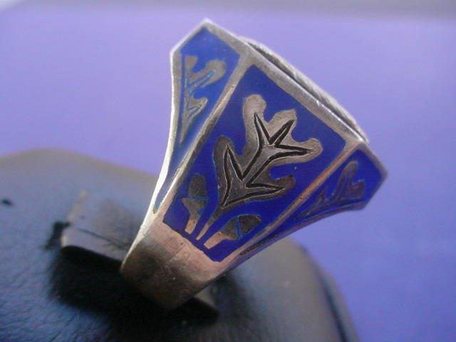 | DESCRIPTION: In the article above, we explain the adventure we experienced a few years back when we unearthed a vast treasure trove of Third Reich-era jewelry. Note in the last two lines of our description we mention that we had heard that there might have been two or three of these rings in navy-blue coloration, but we did not have one of these rare examples. Then, years later, we did manage to purchase separately two of the only three ever made in the blue color and we offer it at this time. It is just like the one shown above except for the color. It also has the “835” silver-content mark. We sold one so in our opinion this one will be the only one to ever be offered by us again.