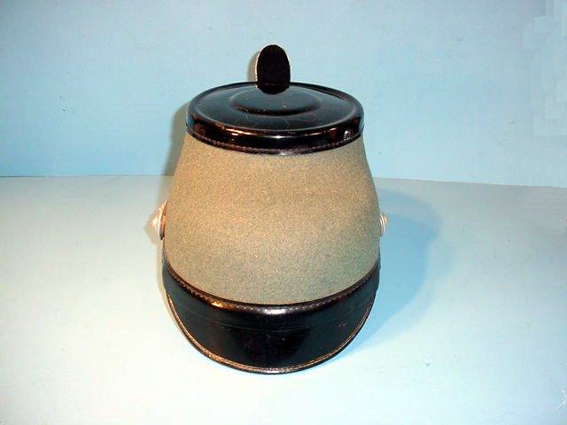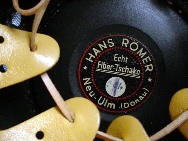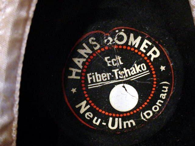 DESCRIPTION: Here is a beautiful shako of the 1936-pattern German police departments (Gendarmerie). For a good description of these shakos, look further up on this page at the various narratives and images; especially the one at POL 2-3. The description is nearly the same except this one is for the metropolitan police, where the one above is for the rural police. That one has brown trim, while this one has black trim. This one is also in grade-A condition and is by the same company, Hans Römer in Neu-Ulm. Fortunately the moths found this one distasteful and there is only one very small bite at the rear above the back visor. As I said previously, the hungry insect probably was afraid of being arrested and charged with assault on an officer of the law!