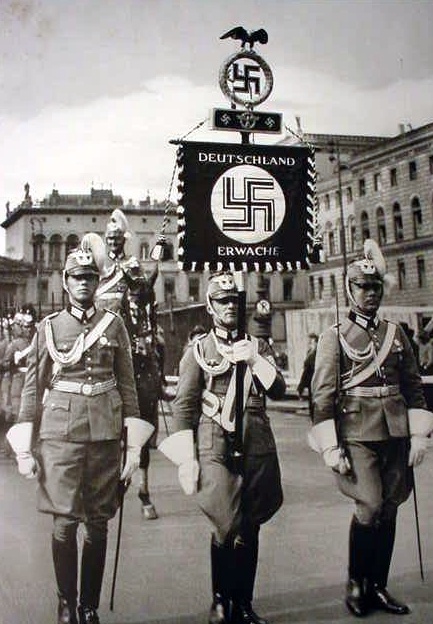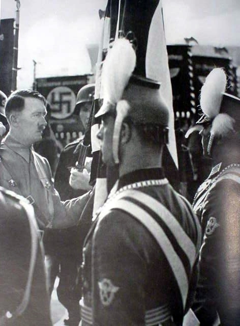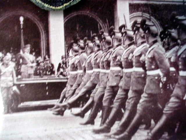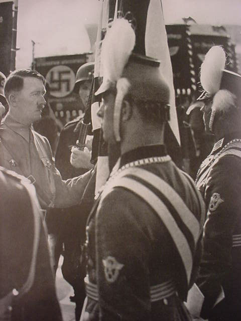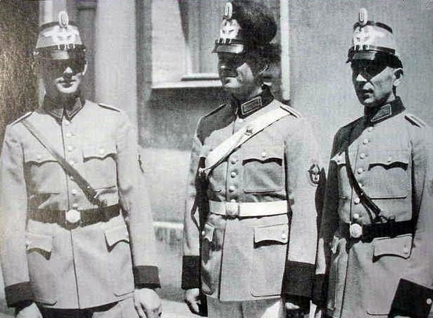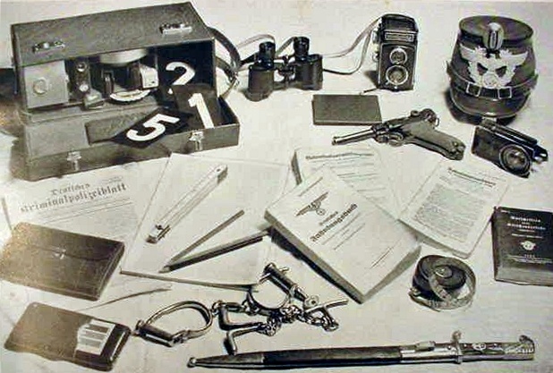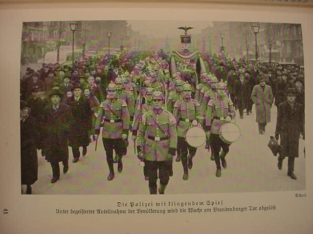 DESCRIPTION: This would be the complete uniform of the Auxiliary Police. Hermann Göring, in his office as Interior Minister of Prussia, issued a decree on 27 February 1933, raising an auxiliary police (Hilfpolizei) (HIPO) made up of volunteers from the Prussian SA, SS, and Stahlhelm. It was armed and had a strength of 50,000, thus doubling the exiting police force in Prussia. It was worn on whatever uniform they had. This arm brassard in various style was worn signifying their service to this group. They joined with regular police units to hunt down and arrest suspected communists and other enemies of the state. See our picture of the SA man with a police officer (Schupo). The units were officially disbanded in July 1933, but were reorganized as auxiliaries in occupied (Liberated) territories for the entire length of the war.