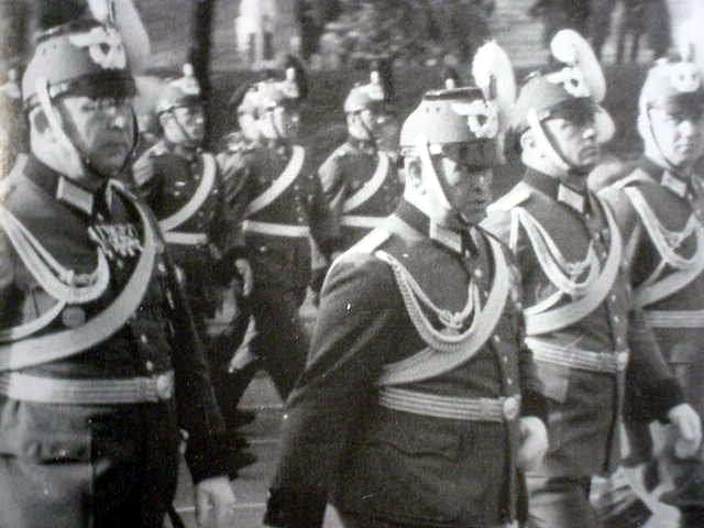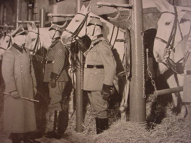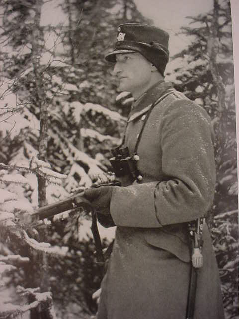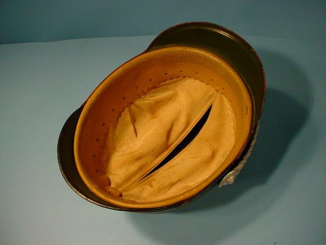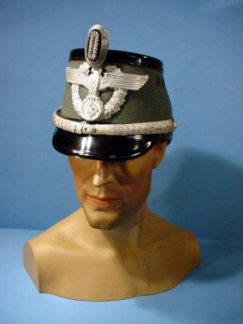 DESCRIPTION: This to me is one of the most beautiful pieces of headgear of the Third Reich. You can see the enlisted model of this one at item POL 2-3 above. This, however, is the rare officer’s model that just never comes up for sale or when one does it is usually either in bad condition or priced much higher than what we offer this one in great shape (for a reasonable price). This piece is offered with the ultra-rare dust cover worn over the helmet in inclement weather. We have never seen one offered. This helmet has the eagle shield that is three times as thick as the enlisted ranks’ models above. The helmet was worn with a horsetail plume on some occasions and without it for others. The chinstrap is scaled with bright, frosted, silver plating, as is the shield. The national badge, or pom-pom, is in beautiful brocade with the national colors. The liner which is similar to the spike helmets of German army officers of World War I is in the silk material. This is the only part of this very rare helmet that shows any significant wear from use. Remember, those items were actually worn! There are also two places where some tough moth took a couple of bites in the green felt covering, and there is some white residue on the wreath that spreads into the felt cloth on the left side of the eagle’s wing. We took a damp cloth to it and it does seem to diminish this nicely; however, the sheer overall beauty of this helmet outshines any very minor problems such as this. The dust cover has some faded-out markings (not discernible), but is in 100 percent immaculate shape and has slots that correspond with an opening for the pom-pom in the air vents at the helmet’s sides. The cover will not go on and tightly fasten probably because a shrinkage of the sewn-in inserts that catch the back and front brim. But it is doubtful that the officer would have bothered to fully secure it in full fashion since it was merely a functional device and certainly no part of a normal parade function. However, to have that with this helmet is really a rarity. So, this is our offering to the collecting public. This is extremely rare, extremely gorgeous, and a reasonable price. (Credit for image number 17 is Digger History.)