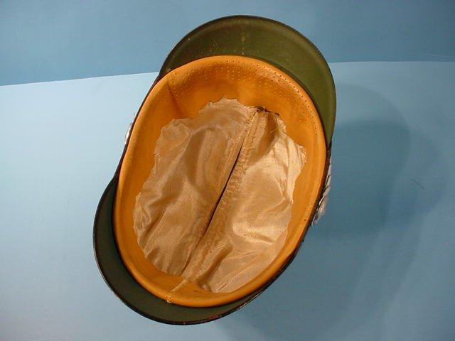 DESCRIPTION: This is the famous shako, the distinctive helmet of the German Police worn during the 1920s up until 1945. The shape and construction is similar to the World War One Jäger helmets and Scharfshützen helmet. The jaunty style is probably, in our opinion, the sharpest looking police helmet of history. The entire uniform of the Schupo (Schützpolizei, protective police) is militarily great! It was in 1936 that the shown shako was adopted with green cloth-covered body and all other fittings in either jet black for city police and brown for rural police. The strap and top brim on this one is brown because it is for the rural Gendarmerie Wachtmeister. At the front is the national eagle emblem with swastika and an oak-leaf cluster. Open at the top centered above this shield was an oval, color cockade slotted in a groove. The one we offer here is in grade-A condition and has a label inside that shows it to have been supplied by the Hans Römer Company of Neu-Ulm on the Danube, and it is labeled a ‘genuine fiber’ Tschako. It’s quite a small size. Even though moths love this sort of cloth there are miraculously only two tiny pinhole-sized moth holes; almost totally unnoticeable, and this is highly unusual, indeed. This is just about the nicest example of this style headgear we have ever encountered, other than the city police example found on our pages. These shakos are exceedingly rare and the Rural Police ones almost never show up at all. Most any we have ever seen offered on the internet were either badly moth-eaten or were missing the Kokarde that is practically impossible to replace. All in all, this may be the best one you may ever see.