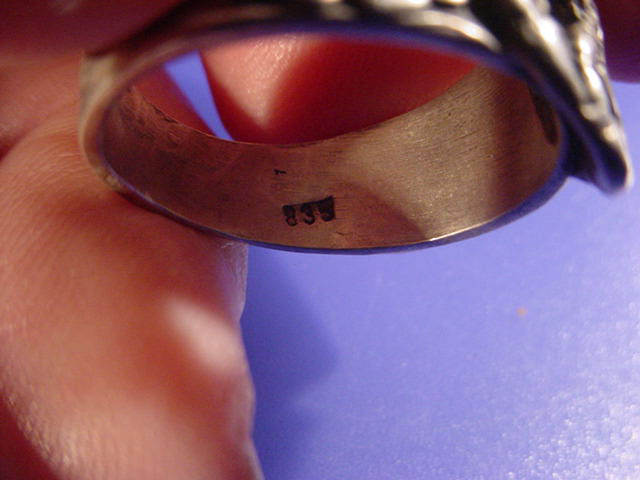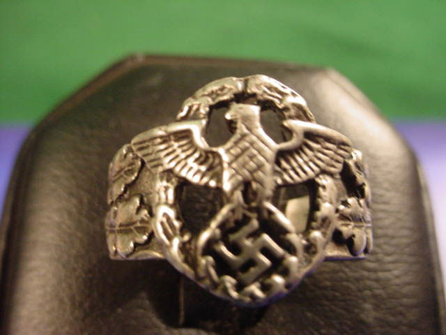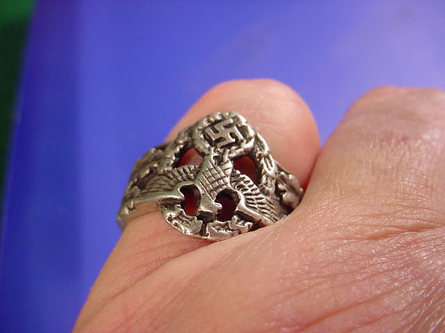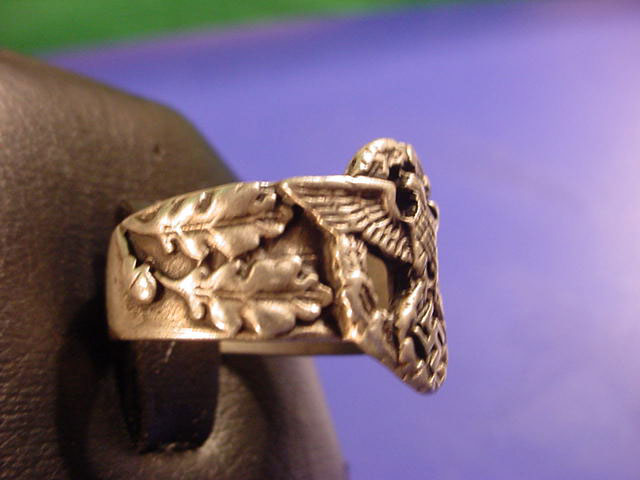 DESCRIPTION: This beautiful ring is the one ring that has been copied the most. While companies like “Outpost Rings” sells a copy of it labeled as a reproduction, other more unscrupulous dealers sell it as “Original”. The obvious is apparent however when the real thing is placed beside the copy. The original that we offer is first of all made back in the 1930’s or 1940’s from steel dies while the repros are turned out in “lost wax” molds. There is also a copy out there in “cyber coo-coo land” that has a presentation inscription inside Also the repros have SS runes inside as well. The Polish and Latuian scallywags have attempted to copy many of our originals, but thanks goodness they can be counted on to screw them up in more ways than one. The originals cannot be duplicated because these malefactors have only managed to produce some deplorable attempts at copying our original Third Reich pieces. Now as to this Police ring it features the later version of the Police eagle as adopted in 1938. It has of course the wreath of oak leaves with even larger oak leaves supporting the sides. It was struck back then in steel dies and in genuine 835 silver and the silver mark is inside the band. The detail is incredible unlike the forgery attempts. Many collectors consider it to be the most N.S. looking design among all other NS rings. It certainly is beautiful and dramatic looking. The open work used in the design goes far to enhance its beauty. We are proud to offer this genuine piece of Third Reich history.