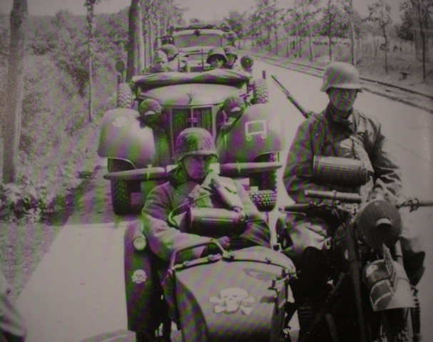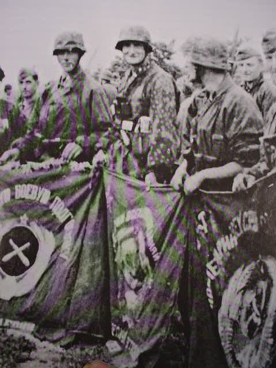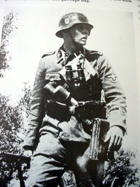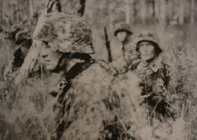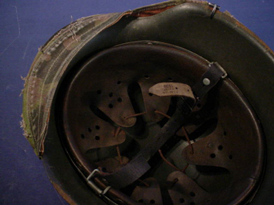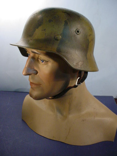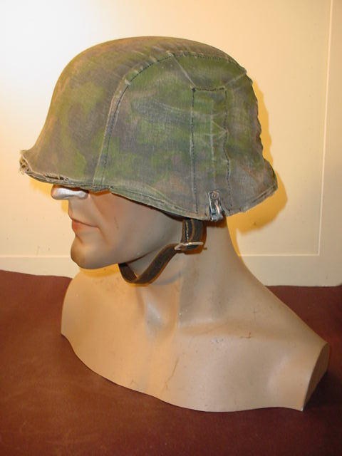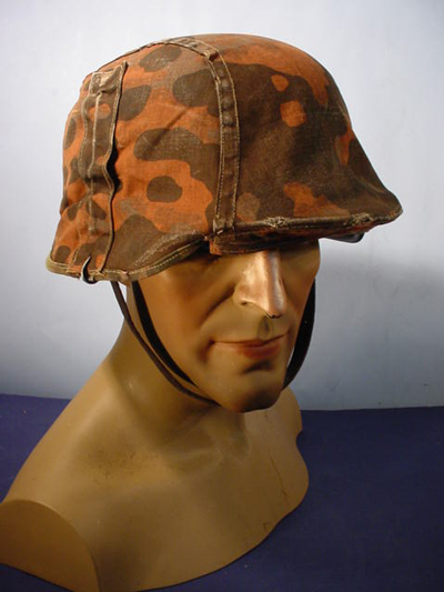 DESCRIPTION: Refurbished Waffen SS helmet with reversible camo cover M-42 model, large size probably a size 60 (rare in this size). This one has been repainted, re-decaled, new liner and marked strap and the reproduction camo cover looks fantastically authentic. The artist has combat distressed both helmet surface and the cover as well as only he can do, that is why we call him the Michelangelo of refurbishment. Again, I say, that we hope that some nefarious dealer like the one in Bowie, Maryland doesn’t get hold of this one because, unfortuantely, it could be sold as the genuine article. You will love it. The strap is stamped Larsen Berlin 1939. Frighteningly real looking! PRICE: SOLD |