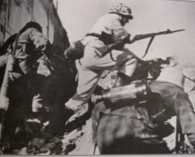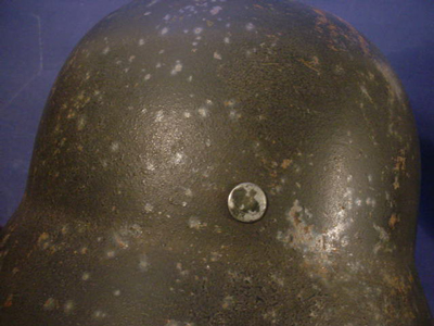DESCRIPTION: Here is an M-40 camouflaged helmet with the typical colors all mashed together in the most delightful panoply of hues. This one is a true work of art that was produced using a 100-percent original WWII German helmet shell. The distress points in the paint and decal come together artistically to produce a fine-tuned realistic presentation. Remember, when you purchase one of these refurbished helmets from us you are not buying a reproduction. These are absolutely real helmets with a beautification job. Why settle for an outright reproduction? This one is frighteningly authentic looking and, to we Germanophiles, beautiful! PRICE: SOLD |