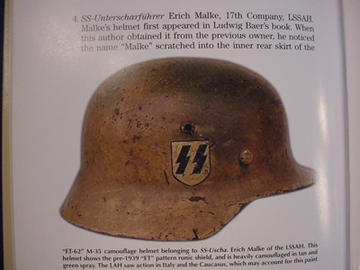 DESCRIPTION: This is of course an original helmet shell 100% original. So what we have here is an original WWII German helmet with a custom beautification. The camo paint is heavily applied with tan and green spray just as the originals were finished. It is done up in the form used by the LSSAH (Leibstandarte Adolf Hitle)r. The LAH saw action in the Caucasus and Italy which accounts for the paint scheme. The decal was applied even on the real ones after the camouflaging, and it has a new chin strap and liner, in German size 56 strap (stamped Larsen Berlin 1939). A good looking helmet very professionally accomplished. PRICE: SOLD |