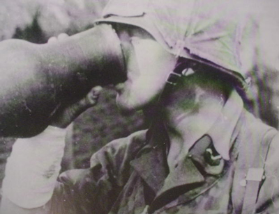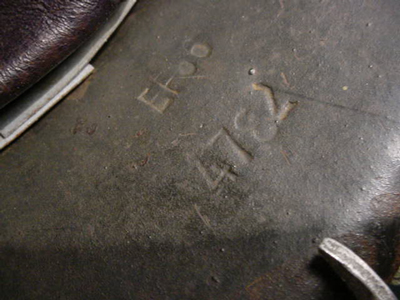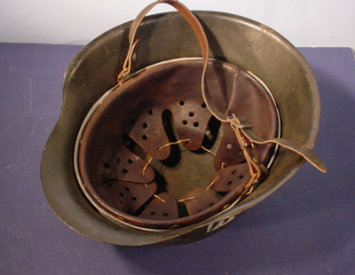 DESCRIPTION: This is a model M-40 shell with rolled edges, replaced decal, liner, chinstrap, and refurbished like the others above, BUT this one looks like it has the original paint on the 100-percent original German helmet shell. Honestly, it sure looks that way! Even the letters at the back of the shell are rather clear. When a helmet is repainted it generally loses the numerals and letters. Gentlemen, you may have an almost original combat helmet in this one. Nice pigskin liner and company marked chinstrap. The decal is frighteningly real appearing. This is a ‘special’ one! Remember this is not a repro; it is real, genuine German WW II Stalhelm that has been brought back to “good health and beauty.” PRICE: SOLD |
