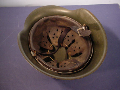 DESCRIPTION: This is one of the handsomest of the refurbished helmets that we have had. It is a model 35 and is in liner size 59 (big!). This would have been considered a dress parade helmet in 1938-39 but was used in combat also in the early Polish Czech and French incursions. Used by the elite LAH, Totenkopf, Das Reich and other VT troops. The finish has been accurately reproduced with the apple green finish that collectors love so much. The decals are perfect in authenticity and appropriately aged. The chin strap is company marked and it has a head stamp IV-1938. Nice pigskin liner. All in all, a beautiful restoration job on a 100% original WWII helmet shell. In other words, an original German helmet with a face lift. And an excellent one that! PRICE: SOLD |