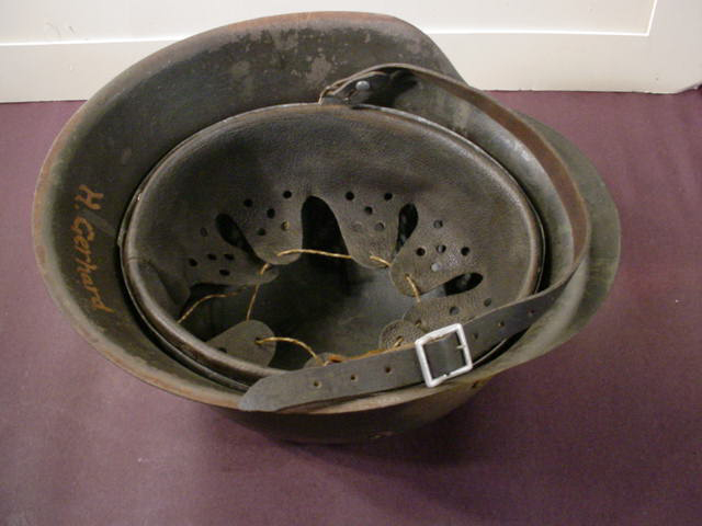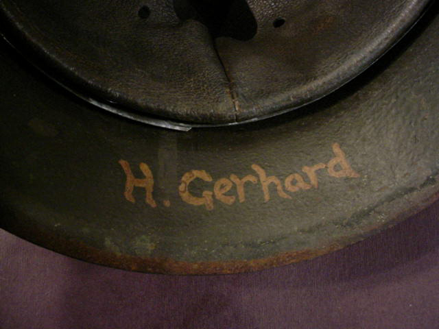 DESCRIPTION: Here is a nice looking Waffen SS refurbished helmet - again the helmet is ‘real,’ it is an authentic German helmet that has been refurbished expertly. It has had cosmetic surgery - in other words, repainted in the colors normally associated with what has come to be known as the ‘Normandy’ camouflage colors. A new chin strap, new liner and decal. At the back of the shell is what would be the name of the SS trooper who would have worn it - H. Gerhard. Appropriate wear is depicted in the paint job. The darn thing looks positively real, honestly scary-real. It is of a fairly large size (about Ger. 59). A spectacular piece of the refurbisher's art . PRICE: SOLD |