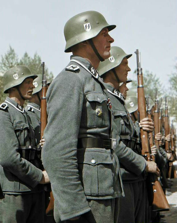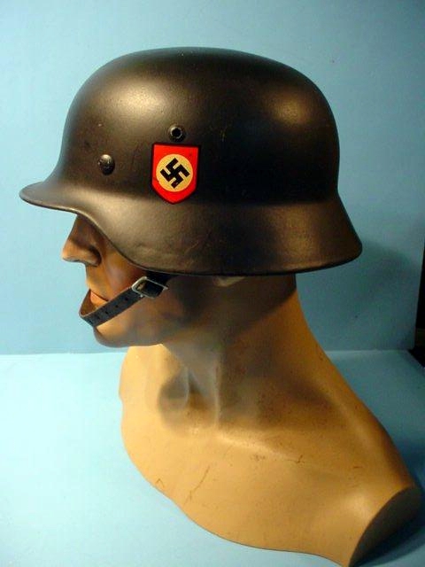 DESCRIPTION: This M-35 helmet was the type used by the Allgemeine- and other elite units requiring black helmets for parade use. The finish is in flat black and the runic shields are of the C. A. Poacher design. This, of course, is an original helmet—not a copy. It has been professionally refurbished by our master restoration expert. New paint, new liner, new chinstrap, new and perfect decals. Yes, wonderfully refurbished, but remember, it started life as an authentic German-manufactured helmet. It’s about a German size 56. As usual there is a danger to most of these helmets and that is that they are so real looking and authentic that some of them have been sold as real by shady folk who have bought them from us.