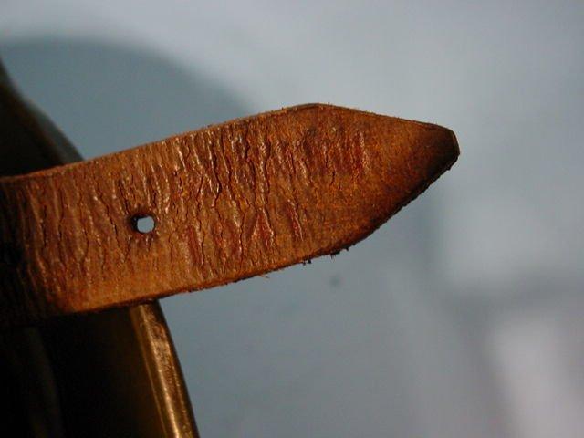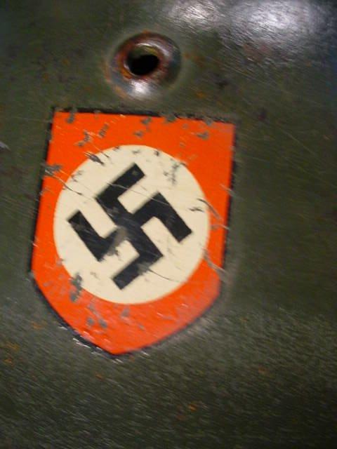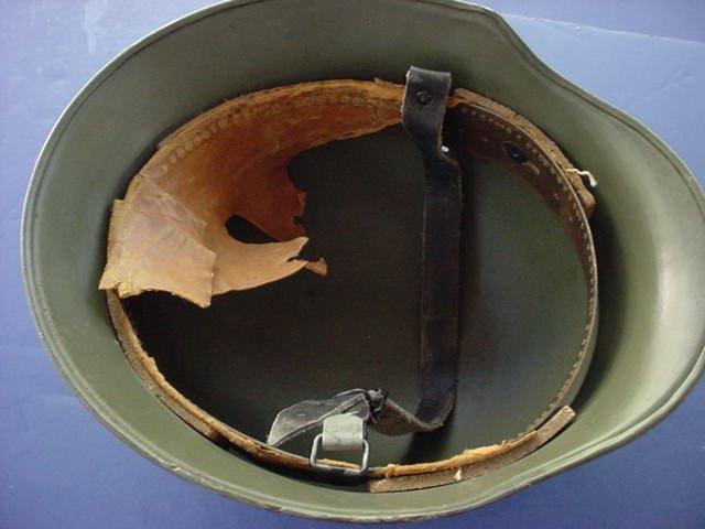 DESCRIPTION: Here is a great pea-green, Mod-35 helmet that has been excellently reworked it is 100 percent an authentic German helmet shell with new paint job, new liner, decals, and chinstrap. It’s amazingly real looking (just like an original). It can only be hoped that some unscrupulous dealer doesn’t sell it as authentic. It’s a fairly large size (about a 56). It has a nice pigskin liner and super decals. These were dress helmets for the Waffen- , but, when the war thickened—at least early on—they went off to the combat zones. This is just a really fine example of the Deutsche Stahlhelm while they were at their finest looking.