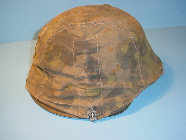 DESCRIPTION: This is a Mod-42 single-decal helmet with camo cover. Of course, it’s one of our original helmet shells that have been refurbished. As we have said before, this is a real German helmet. It has been repainted, re-decaled, relined and has a new chinstrap and an accurate state-of-the-art camouflage cover. Examples like this go out fast and we just listed it so don’t let the grass grow under your feet if you want a great textbook example like this one. This one has the very fine pigskin liner and is in the German size 55. The camo cover is reversible from summer to fall coloration. The cover has been realistically stressed and is very, very authentic looking. The decal is perfect, as is the paint job. This is another masterpiece from our “helmet king.” They don’t come nicer or more real looking. Perhaps that is because they ARE real helmets with a professional face lift.