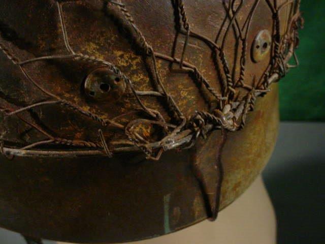 DESCRIPTION: This is the best by far reproduction paratrooper helmet we have ever seen. It is done up in repro camouflage with the chicken-wire appendage. Everything is as if original; all the liner straps are perfect. The liner is properly aged looking. The grommet strap holder on one side is replaced properly, though not painted, but this is very easily remedied. Other than that small thing the helmet is in fine condition. The camouflage is in the Crete colors with the camo wire placed over it and this makes for a very dramatic effect. The Fallschirmjäger were “the elite of the elite” but then you already know that! The Luftwaffe-eagle decal is exactly as the original. The liner and straps are extremely authentic and of the hugest quality and aged with all the proper configurations. This is a helmet to be proud of and costing a tiny fraction of what a genuine period one would cost refurbished by a master of the art who had done all of our other offered helmets.