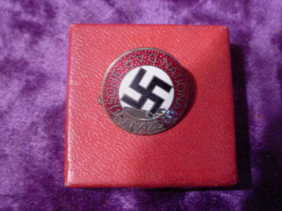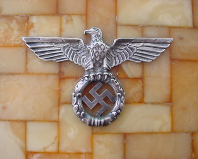 DESCRIPTION: This is the earliest of the National Socialist flag pole tops. It would screw into the wooden shaft of the flag pole. It was used in the 1920’s during the Kampfzeit (“The Struggle for Power”). It was used by the SA (Stormtroopers) and the early SS formations that were Hitler’s Body Guard. The early eagles had the sharp pointed wing tips; later they were more refined, these are very scarce and seldom show up. This one is in practically perfect condition. PRICE: SOLD |
