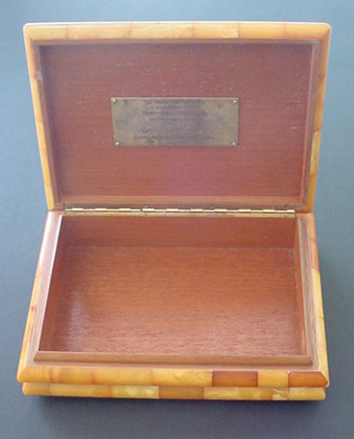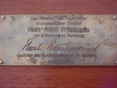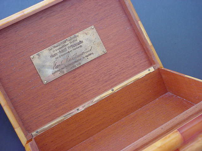 DESCRIPTION: Hans-Adolf Prutzmann -31 Aug 1901-21 May 1945 was a superior SS and police leader. As an SS Obergruppenfuhrer. He was the senior N.S. official administrator of Latvia. After completing his studies at the Gymnasium, Prutzmann studied agriculture, before he became a member of various Freikorps between 1918 and 1921. Despite being a member, he nevertheless avoided military and typical Freikorps-related aggressive situations. This however, changed in 1923, when he interrupted his studies to accompany a Freikorps involved in the Upper Silesian uprising. Afterwards he worked for seven years as an agricultural official in Pomerania, Brandenburg, and East Prussia. He joined the SA in 1929. Since Prutzmann had become quite a radical soldier as a result of his Freikorps experiences, and since his own personal goals did not match the clearly milder thinking found in the SA, he left the organization in 1930 and transferred in the same year to the SS. At the same time, he was admitted to the Nazi Party. As of this point in time, Prutzmann’s career began a steep rise. While functioning as a Member of the Reichstag, he was appointed SS Brigadefuhrer in November 1933, and in February 1934 he was given the rank of SS Gruppenfuhrer. At the same time, Prutzmann was appointed leader of the SS Upper Division Southwest in Stuttgart. From March 1937 until May 1941, Prutzmann led the SS Upper Division Northeast whose headquarters were in Konigsberg (now Kaliningrad). By April 1941, Prutzmann had been appointed Generalleutnant (Lieutenant General) of the Police. From June until October 1941, he was Hoherer S.S. und Polizeifuhrer (Higher SS and Police Leader) of Russia-North, the post being responsible for internal security and combating the murderous red partisans. He held the same position in the Ukraine and Russia-South until the summer of 1944. He also commanded Kampfgruppe “Prutzmann” in the Ukraine during the early summer of 1944, and was awarded with the German Cross in Gold for his action. From June to November, 1941 Prutzmann held the post of higher SS and Police Leader. Hoherer SS und Polizeifuhrer or HSSPF for Latvia; effectively this made him ruler or with Hinrich Lahse, co-ruler of Latvia. His office was moved to the Latvian office of the S.S. Sicherheitsdienst or security service as HSSPF Latvia. Prutzmann was in charge of the SD. It is known that Prutzmann was responsible for removing the Jews of Latvia into Ghettos. One of his last promotions came in September 1944 when Prutzmann was appointed by Heinrich Himmmer as Generalispekteur fur Spezialabwehr (General Inspector of Special Defense) and assigned the task of setting up the Werewolf force’s headquarters in Berlin and organizing and instructing the force. The Werewolves were volunteers that should have formed a nucleolus of resistance fighters. Prutzmann had studied the guerrilla tactics used by Russian partisans while stationed in the occupied territories of Ukraine and the idea was to teach these tactics to the member of Operation Werewolf. As originally conceived, the Werewolf units were intended to be legitimate uniformed military formations trained to engage in clandestine operations behind enemy lines in the same manner as Allied Special Forces such as Commandos. In early 1945, under orders from Himmler, he directed the assassination of the Allied-appointed mayor of Aachen, Franz Oppenhoff. Shortly before the war ended, Prutzman was captured by the Allies and became a prisoner of war. While in their custody, he ended his own life. Whether his suicide happened in Luneburg, or as another account has it, at an interrogation came at Diest in Belgium is not quite clear, but it seems certain that his date of death was 21 May 1945. Dates of Ranks Earned: Notable Decorations: This was the career of one of the highest placed SS officers of the 3rd Reich. A German tragedy while he lived, he actually lived the words of the song - - - Wenn alle untreue werden so bleiben wir doch Treue ! The box or chest made of Prussian amber was presented to SS Gruppenfuhrer and N.S Senator Prutzmann by none other than the Gauleiter and Reichstatthalter Karl Kaufmann who was also famous in his own right. A Reichstatthalter is a Governor and Gauleiter would be the supreme Party Leader of a regional branch of the NSDAP (made up of many such districts.) Karl-Kaufmann (20 October 1900 – Dec 4 1969) was the NS Gauleiter in Hamburg. He was born in Krefeld. He served as a war volunteer in WWI and in the Freikorp’s Brigade Ehrhardt 1919-1920. He was a founding member of the NSDAP in 1921. He quickly became one of Adolf Hitler’s favorites. He was appointed Gauleiter of the Gau’s Rhineland and Ruhr in 1922-29, he then was appointed Gauleiter of Hamburg in 1929, a post that he would hold until 1945. He was also a member of the German Reichstag. After Hitler gained power on 16 May 1933 Kaufmann was appointed Reichstattthalter (Regional Governor of Hamburg with absolute power over 1.8 million people. One of his past accomplishments was to turn over control of the city’s Fuhlsbuttel Prison to the SA and SS where it became the nucleus of the Kila-fu concentration camp. Adolf Hitler declared Hamburg a fortress, similar to Festung Warshau. The cities of Posen or Kolberg. In April 1945, Kaufman wanted to capitulate without further struggle. After negotiations and the publication of a pamphlet that Kaufmann prepared, suddenly (without Kaufmanns consent) - Hamburg was declared an open city by Admiral Karl Donitz. We mention this because it is ironic that Prutzman and Kaufmann were close associates and friends (This will be borne out when we describe the box.) The amazing thing was that due to Kaufmann’s attempts at the Hitler forbidden capitulation he could possibly have been on Prutzmann's hit list kept by the short lived Werewolf units. He could have ended up like Franz Oppenhof the Mayor of Aachen who was assassinated by the order of SS Obergruppenfu
