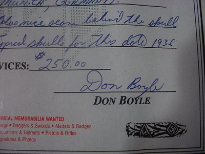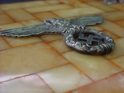 DESCRIPTION: This is a wonderful presentation item from an anonymous presenter. It is a silver box with silver and enamel decoration very professionally accomplished, although we do not know if it was actually presented or personally commissioned by the Reichsprotector himself. The markings do not seem to be German so we logically presume that a jeweler either made it from an existing box or else made it from scratch. The jeweler may have been Czech; the markings are shown in our attached pictures show the marks clearly. The piece measures across the top 6 ½ x 5 and it is 1 inch deep, the box lid has a depiction of Arno Breker’s famous statue “Die Partei”. This was part of a pair of heroic figures that flanked the entrance to Hitler’s New Reichs Chancery. This one was Brecker's monumental statue representing the spirit of National Socialism. However, the statue in front of the entrance of the New Reichs Chancellery holds the torch in the opposite hand. Why? The figure of this Aryan man is flanked by 4 symbols: No. 1 The enameled Swastika shown in a silver wreath. During WWII the planes flown by Heydrich all had this symbol -- it was an ancient German runic character that stood for “Victory”. He flew a BF 110 in the fighter group 11. J6 77 in Norway in 1940. He had the rank of Major in the Luftwaffe. So you can see this symbol hereon the box in fine silver art work. Engraved on the front of the box are the words “Die Ewige Flamme Brent in Unserem Herzen Fur all Zukunft (translated: The eternal flame burns in our hearts for all the future). This alludes directly to the flame of the torch that is held in the hand of the Breker figure depicted in the top design and of course the flame represents the belief in the N.S. agenda. It all ties together beautifully in this exceptional relic of a very turbulent era. SS Obergruppenfuhrer Reinhard Heydrich, in my opinion was not murdered by the British with their Czech assassins because he was a” bad man”. No, he was foully murdered precisely because he was too good! The British War lords decided it was imperative to kill him because quite frankly his popularity was spreading and European people were starting to see very definite positives in the National Socialist agenda. He enjoyed the support and was well liked by the more decent of the Czech citizenry because he performed so many acts of charity and social progress in Czechoslovakia while he was Reichs Protector of Bohemia and Moravia and as President of the European Interpol, he brought justice to many arch criminals that had been amassing fortunes while exploiting the Sudeten and Czech people. He brought in the Red Cross for the first time. Yes, he was merciless to the enemy. He was after all a Policeman -- a Super Policeman. He was a strict authoritarian and dedicated to the rule of law and order. Yes it is very regrettable what was done to the town of Lidice.in the aftermath of his murder. That was inexcusable but as the American military has often stated “War is Hell” and to make the omelet you must break a few egg! Also, the Czech and Yugoslav partisans were the most evil lot that the Devil ever sent to earth! The tortures and ghastly murders perpetrated against Germans both soldiers and innocent civilians were fresh in the minds of the revengeful combat soldiers who executed Lidice. The killing of SS Obergruppenfuhrer Heydrich was as they envisioned it “the last straw”. Make no mistake, he was very much admired by his “Band of Brothers,” the SS. I hope to God the world never again sees as horrible a conflict as the European continent had to suffer in WWII (a completely fratricidal war!). This cigar box was found in Prague and had been looted by Russians or by Czechs. It was later sold to a German part time antique dealer and eventually made its way to the Stuttgart Waffen-Borse where we managed to purchase it. We feel it was taken from either Heydrich's country villa at Panenske Blezany or his office at Prague Castle. Many other items were looted at both locations and we have had some other of these items in the recent past, but nothing so wonderful as this one. I believe it says it all! The whole agenda and mythos of the N.S. movement and the ideals of Reinhard Heydrich are at least partially revealed in art form. This has to be the epitome of SS items. No other item could be more historically important in WWII relics. NO LONGER AVAILABLE |