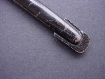 DESCRIPTION: Another fine SS officer candidate sword. This one is unmarked with company name in Solingen. It also has no kulturzeichen on sword or scabbard. This leads us to believe it was made at the Dauchau forge (go to SS 15-1 in this SS section to see an officer sword by Paul Muller and there is a brief explanation of Muller's Dachau swords. We explain that the Dachau pieces were not marked at all.). They are much rarer than the company-made examples. The purpose of the officer candidate sword is visited on this page at SS 35-14 and SSDAG 1-8; please read for details. This sword that we offer here is without the leather carry strap. The scabbard has been professionally repainted but this does not affect its originality and value. The SS officers would often repaint their swords if they looked worn and dingy. The grip is in excellent condition without chips in the ebony wood. The blade is in perfect condition. These blades were not plated and were in natural steel in keeping with the SS tradition of natural purity. This sword must have belonged to a very tall SS man because it measures 41" long in the scabbard...largest we have ever seen! All the metal parts are in bright immaculate condition, like the example shown above (SS 35-14). Would be a brilliant addition to any SS or general sword collection. For further description of Dachau swords, see Tom Wittman's book, Collecting the Dress Daggers and Swords of the German SS. PRICE: SOLD |