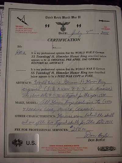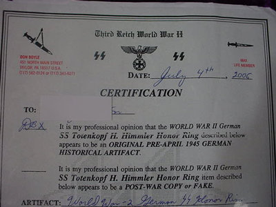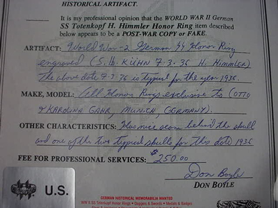 DESCRIPTION: Still the absolute “Holy Grail’” of the SS collectors, the Honor Ring of the SS stands as the ultimate collectible and for some it has even deeper meaning than that! It took on a mythos of its own! At least two books have been produced, chronicling facts and pictures that pertain to these rings. To the SS of old and to the collector of today, the rings have great significance and are even more important than the daggers or the swords. The ring emerges as the singularly most coveted and prized of all the SS trappings and awards then and now! The formal award of the ring was only under approval of the Reichsfuhrer SS Heinrich Himmler and in this capacity he practically had to know every applicant to be issued one. By the way, this was the only truly issued ring of the N.S. apparatus; all other rings of the Party, Wehrmacht and SS were purchased by the wearer. The only exception being the Victory rings produced by Herr Franz Schnell of Halle am Salle, but as far as we know, those rings were to be issued but never actually reached that point due to the unfortunate outcome of the war. Once again, Germania International has located and now presents another fine Honor ring. 100% original with authentication document issued by Mr. Don Boyle, the author of the first and best book on the subject, “SS Totenkopf H. Himmler Honor Ring 1933-1945." We show a picture of this Boyle certification in our images. Also there is an incredible accumulation of papers copied out of official U.S. Archives concerning this SS officer. The former owner was SS Standartenfuhrer Dr. Ehrhardt Hamann whose SS number was 351 382. Among this stack of official documents are at least 3 pictures of Doctor Hamann and three of his wife, Erika Richter Hamann. Also included is the questionnaire from the Race and Resettlement Office (Rasse und Siedlungsampt Fragebogen) and a complete Lebenslauf (his and her personal histories handwritten). The SS Ahenentafel completed is also all there giving every detail of his and her existence and ancestry. There is a letter from the office of the Reichsfuhrer SS Himmler with approval. The papers show that Hamann was born Jan 13, 1900 in Halle-Salle. There are also official papers concerning Erika Richter, the name of his wife before their marriage, with her “Lebenlauf” and Ahnentafel; it shows her as being in the HJ Madelshaft in 1940. There is also another SS approval from the Reichsfuhrer SS Himmler. The Rasse und Siedlungsampt papers are complete and approved. All of the separate groupings of papers have the stamp stating copy from the National Archives and records administration. There is an official letter among the documents from the “Mutterdienst” (Mother's service) to Frau Hamann. Also seen is a letter to the Rasse und Siedlungsampt from Dr. Hamann on official N.S Party stationary. He signs it Dr. Hamann Gauarztefuhrer and SS Standartenfuhrer. Gauarztefuhrer is a term meaning Medical Director for the Gau (district), so we know he was a high official in the medical arts. We also find a note by Dr. Ehardt Hamann to the effect that someone committed suicide (Selbmord). At some point the report was dated January 23, 1943. There are other official letters from Doctor of Medicine, E. Hammon. Many, many letters between the Doctor and the Race and Resettlement Office concerning certifications, etc. Many such letters and correspondence. Signifying that he worked closely with that official office. There is an SS officer file that shows his awards, religion, family history, assignments. And other sections of the NS administrative apparatus, dates of service and honors received. And here is what every collector likes to see—in one block it shows that he received the “Totenkopf ring” and that his Beruf (Specialty) was as Doctor of Medicine. It also shows he won the Social Service Medal, the Sudetenland Medal and Service Medal of the NSDAP in bronze and an Alte-kampfer "Old fighters" abzeichen. There is an order from the personal staff of the Reichsfuhrer ordering him to Norway to assist the famous Brigadefuhrer Dr. Conti and there is a letter from Dr. L. Conti confirming this. A letter is also here promoting him to SS Standartenfuhrer on 11 March 1940 and a congratulatory letter from the Oberabschnittes Elbe. One of the letters is from Reinhard Heydrich, the Chief of the Reichsicherheitspolizei, and it makes mention that Hamann was a Party Member since 1929 and has been a leader in the fervent work and struggle in German Health practice. Letters from the Oberabschnitt Elbe and from the Police President and the Gauleiter in Halle. Much too numerous for complete listing -- 103 pages from the archives and then a professionally assembled bound supplemental documentation booklet prepared by Ross J. Kelbaugh of the historical graphic research service in Baltimore, MD. This grouping has explanations of the records of the National Archives. Here also is the SS Dienstaltersliste Der Schutzstaffel Der NSDAP Berlin 1942. Here listed are the names of the SS officiers -- Obergruppenfuhrer to SS Standartenfuhrer up to 1942. This gives the name, SS section, Party number ,birth date and rank plus the times and places where he was promoted. Two copies are included showing Dr. Hamann’s records before he received the ring and another where it shows he received it and also the Iron Cross 1st Class and that he was assigned to the staff HQ XVIII and was promoted to SS Standartenfuhrer January 30, 1940. Enclosed here are the pictures of Dr. Hamann and his wife Erika. So here is provenance far beyond what is normally associated with any of these rings when rarely found. It is one of the best? (We think) What do you think? Along with it, as we have stated, is the positive certification of Mr. Don Boyle. The ring is unusually huge, measuring a 16 inch size. We have never seen one this big. It is quite worn as so many of them were due to everyday wear -- to some collectors this is part of
