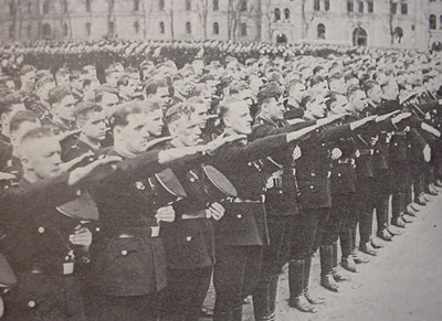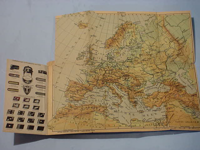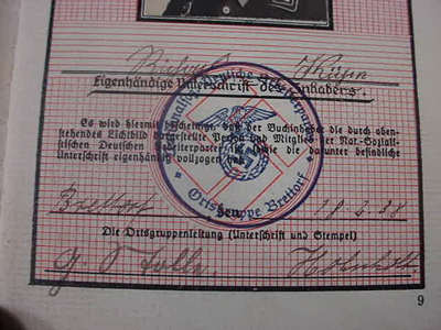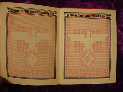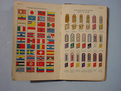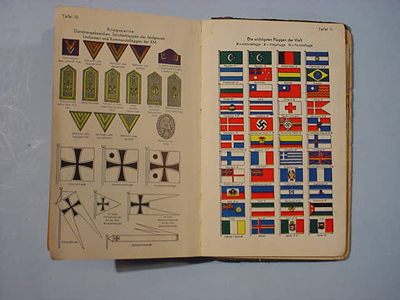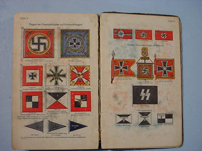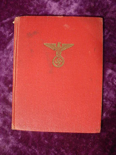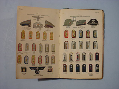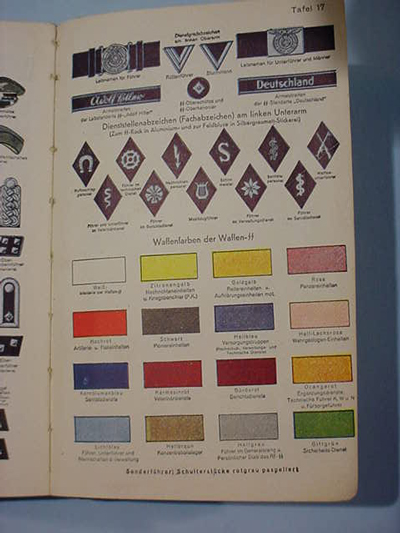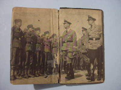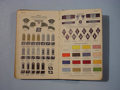 DESCRIPTION: By ID we mean the SS recruits handbook, pocket-size. Ok, it's not in the greatest condition...loose spine, some staining on the color plates (minor), white pages turning slightly brown from 75 or so years of age. The map and a coupe of the last pages are loosened and detached, no notations are made in the daily diary section. Each date throughout the book has a separate printed blockand in each are histories of what happened or happens on that date. For example, April 20th is the birthday of the Fuhrer, November 9th ceremonies at the Fedherrenhalle in memory of the martyrs of the Putsch, November 10th Martin Luther born. In the front cover is a saying by Heinrich Himmler and in the back cover is a picture of Himmler reviewing the SS recruits. The best part is 24 pages of color plates of flags, uniforms, insignia, shoulder boards, medals, collar tabs, etc. As we said, it is distressed but extremely rare. The book measure 5" x 3 1/8" and about 1/2" thick. PRICE: SOLD |