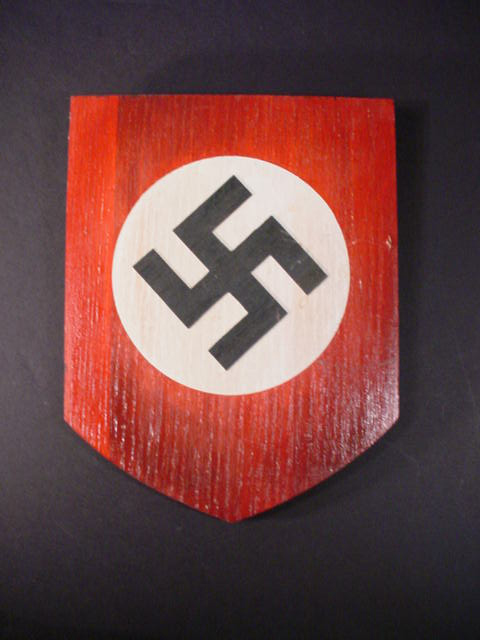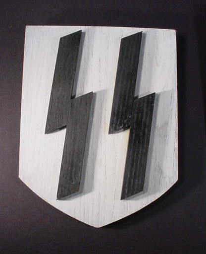 DESCRIPTION: These two large wooden plaques were taken in 1945 by a GI who sold them only recently. They are from what we are told formally from the dining hall in the barracks of the Nuremberg Headquarter SS kaserne. This building is still there. It was built quite near the grounds where Nuremberg Reichsparteitag (party rallies) were held each year and it is rumored that within its confines there are still rooms (kept locked) where certain N.S. inspired wall murals are still intact. These two plaques were part of the décor of the room where the SS troopers had their meals. They are certainly decorative and large measuring 10 x 7 ½ inches. They are beautifully made. The SS plaque is a 3 piece construction where the runics are separate wooden cut-outs applied to the shield. The swastika is also cut out of thin veneer wood and applied to the circle within the shield. Of course you will recognize the symbolism. They are constructed to look like the decals on the sides of the SS helmet. Very dramatic and although they look new because of their immaculate condition they are assuredly period pieces. When our consigner received them he removed the string type hangers off the back and replaced them with picture wire for more stability. Very great looking indeed. PRICE: SOLD |