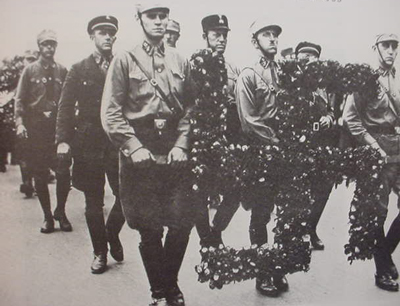 DESCRIPTION: Here is the official song book for the SA-SS and other “Strassekampfer” of the Party; it is comprised of 63 militant marching and campfire songs. It was published by the German culture watch (Kultur wacht) in 1933. Many of the songs are the traditional songs of the SA. We have had one of these before but in a bit worn condition. This one is in mint condition. Inside the front on the 1st page it has the stamp of the SS=Sturm 5/31 Berchtesgaden. This was one of the SS units that guarded the Berghof, Adolf Hitler’s Alpine retreat. PRICE: $155.00 |