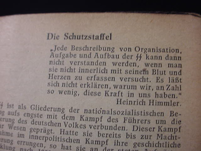 DESCRIPTION: This soft cover book whose title is translated as “You Call the SS” was produced at the SS Headquarters in Berlin under the supervision of the Reichs-Fuhrer SS Heinrich Himmler probably in the late 40’s. It was basically a primer for recruitment in the ranks of the Waffen SS. It is soft cover with 96 pages. It measures 6" x 8" and is in very decent shape overall. It is filled with pictures and text that is designed to show the reader what glories can be achieved while saving the European continent from Bolshevism. Germany and other nations sought to achieve this through the promotion of the SS ideals and the participation of the young men of the Reich and European kin whose bravery, dedication and chivalry was seen in battle for culture, country, and Fuhrer. There are many sayings, speeches and statements by Adolf Hitler, Heinrich Himmler, Sepp Dietrich. Particualry interesting is the oath that the SS recruit verbalizes upon his entrance into the SS organization.”Ich Schwore Dir Adolf Hitler Als Fuhrer." The various elevation of military grades are explained. The SS Junkerschule Bad Tolz is shown and the training of the Waffen SS recruits is explained. The various recruitment HQ of the Waffen SS are listed with addresses and phone numbers for potential recruits. This list explains the title “Dich Ruft Die SS." The young man who wished to join or get information would actually telephone one of these offices and talk to a recruiter. There are also forms at the back of the book that one could send in for information to any of these offices. The book is loaded with information about the Waffen SS, such as ranks, job titles, Waffenfarben (colors) of piping on uniforms of the Wehrmacht. Equivalent ranks between SS and army and many pictures of SS in action. Plus maps, and there is a great center spread of the Fuhrer with his Leibstandarte A.H. at the front. This is the ultimate book on the men whose motto was Mein Ehre Heist Treue! My Honor is Loyalty. PRICE: $485.00 Expensive??’ Say,”RARE” instead of expensive! Say “GREAT” instead of mediocre. |