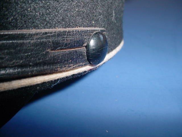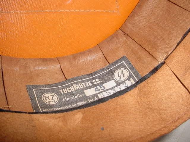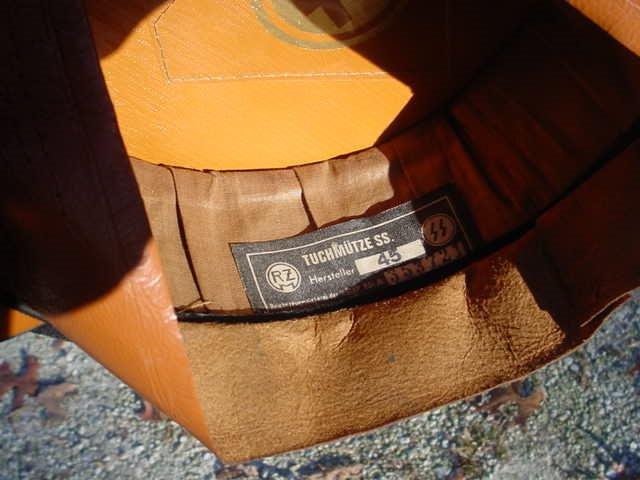 DESCRIPTION: This cap is in fantastic quality with black tricot wool material and Presstoff (replacement leather) chinstrap�that is correct!�and the �RZM SS� is stamped on the visor. This cap has a fully lined interior with orange-tan oilcloth to the crown and orange-tan cheesecloth to all the body lining. The crown lining has the original clear celluloid sweat diamond intact with the large gold-tone circle with the