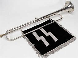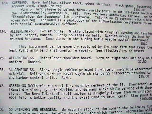 DESCRIPTION: We proudly present an extremely rare Allgemeine-SS bugle. Remarkably, this very bugle was sold in 1973 in the Nazi catalog of Edward P. Rich and Co., who sold rare and scholarly books and historical relics. Dr. Rich was one of the first major dealers in these items. His catalog no. 4 has a picture of the bugle on the front cover and the rear cover. This original catalog accompanies the bugle. (See our images). We were quite fortunate to turn it up again after all these years and it is still in the condition when first sold. The B-flat bugle is wrapped in typical SS bullion cord with coloration black and silver. The tassels are intact and the entire bugle is in excellent condition except for a few dents in the tube. The earliest Nazi eagle with expanded wreath and swastika is adhered to the greater part of the horn. It stands out strongly. This would be the eagle of the Kampfzeit. The entire bugle is nickel plated. Below the eagle is the supplier who was ANT. SCH�PF MUNICH. Dr. Rich said mounted bandsmen carried these bugles across their backs. Here is a chance to acquire a very rare and very handsome relic of the Black SS; extremely historically important.