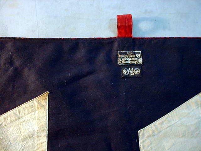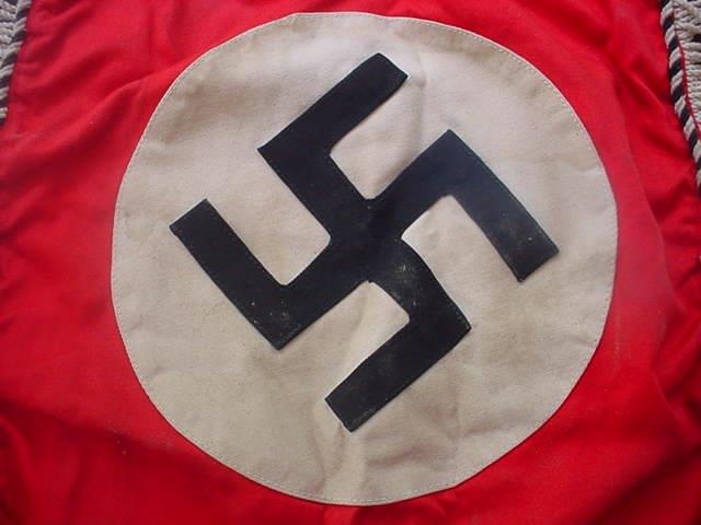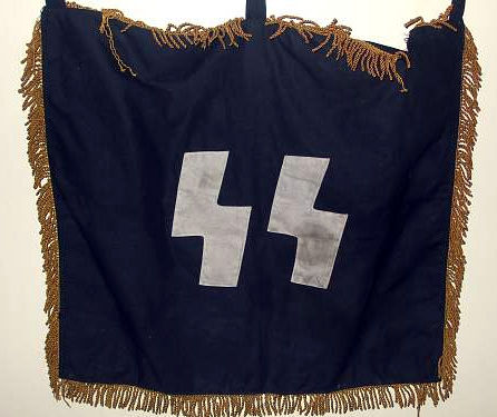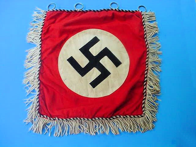 -Leibstandarte Adolf Hitler. As early as the 1920s the piping on flags, uniforms, etc., invariably had silver cord intertwined with black. This stood apart from piping on SA or NSKK paraphernalia and always was distinguishable even in the Kampfzeit (struggle for power). The banner is double sided and its center construction with swastika is in three parts overlaid. The swastika is separately adhered on the white background and this is placed upon the red cloth that is trimmed with black-and-white ropelike piping. The exact same work is repeated on the reverse side. (Double sided). Four brass attachment rings are seen at the top. All along the edges of three sides there is white fringe. The banner is very well made and heavy and it�s in great condition throughout. It measures about 13 x 15 inches not counting the fringe. The fringe all around the three sides is about 2 inches long. Here is an item from the NS