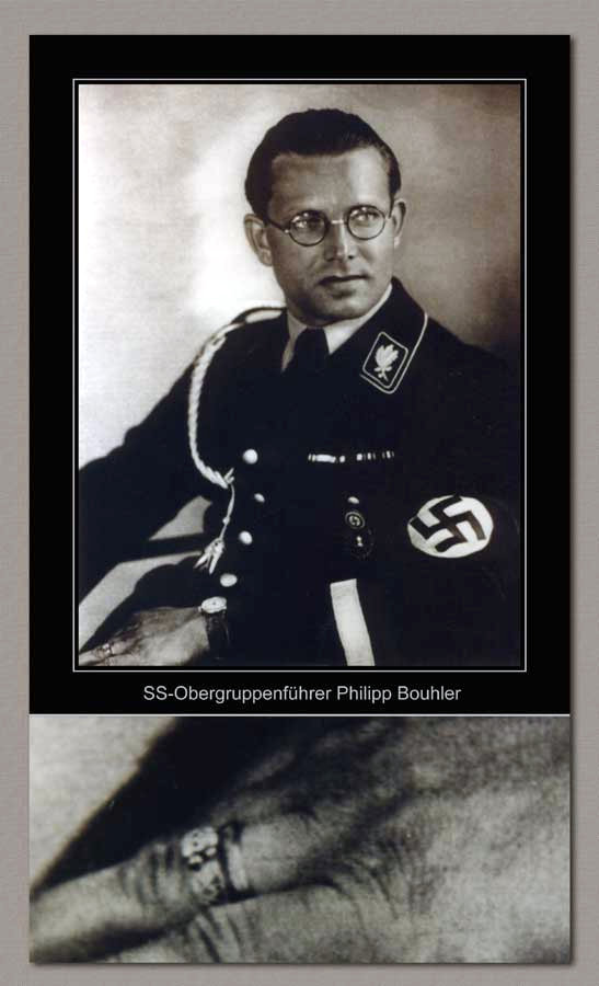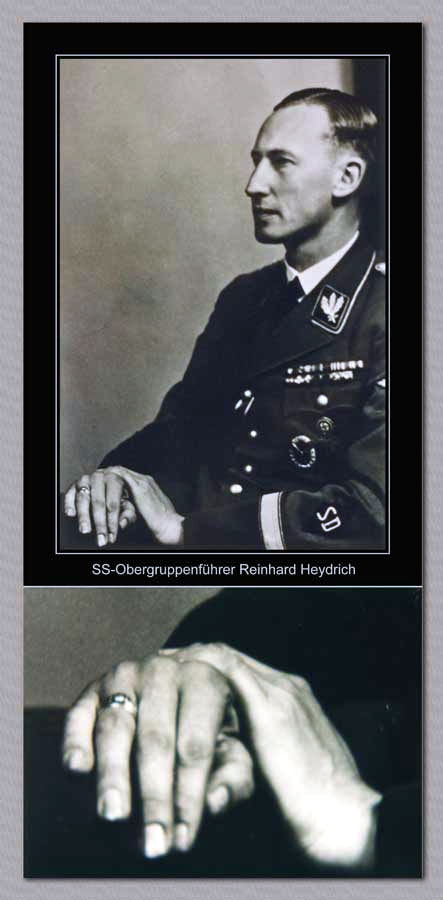 After the foul murder of Reinhard Heydrich, the upper Panensk� continued to be the home of Lina Heydrich, his beloved widow. Up until the end of WWII, the castle became state property after the hostilities ended, then it was taken over by the Communist government. As of 1957, it was used as a home for the elderly. Reinhard would have approved of this, in our opinion. This is what we have been told. The castle was left vacant long after the war, but somewhere along the line the castle was sealed for a time. Then a hired worker was looking about in the lower castle with the idea that he might be involved in any restorations that might be instigated by the Czech government. During his close inspection of the apartments therein, he opened doors that had been shut for decades. All the furniture, paintings, tapestries, had been looted and the rooms were devoid of any items of the slightest value�totally looted! When this worker nudged open the door to a dilapidated bedroom, the door�s hinges emitted an eerie, squeaking noise having rusted because of leaking water from the bathroom above. For years, and for whatever reason, this door was not opened during any of the looting expeditions until now in this exploratory inspection. When the door was freed up from the hinges and opened, to this worker�s surprise there in plain sight was this magnificent ring which he immediately pocketed. The rest of the story is now revealed and it goes like this: The man known to us only by his first name Stanislaus kept the ring for many years and left it to his grandson after his passing. The grandson sold it to an antique dealer in Prague, who in turn sold it to a collector of antiques who, recognizing its historical value, sold it to another collector and finally it came to the U.S. The ring probably was the template for another ring that was made in silver. We have had one of these silver rings in the past and they are quite rare, but this one is beyond rare, and entirely unique! The obvious difference is that the shank or band�the part that circles the finger�is in genuine gold, while the center design (the links) seem to be hand set within the gold framing, and this part is in silver with a pebbled background effect. On the band are wreathed swastikas that are individually jewelry set, in a very ultraprofessional procedure. In all our long years in this field, we have never seen such excellence in jewelry workmanship. The wearing size of the ring is 11 �, a good size for a tall no-nonsense, brave fighting man like Oberf�hrer Heydrich. It is historically noted that when the cowardly British-paid assassins fatally wounded him, he managed to get out of the car and chase them for nearly two city blocks holding and possibly firing a Luger pistol. It�s no wonder that Hitler referred to him as the Man with the Iron Heart.