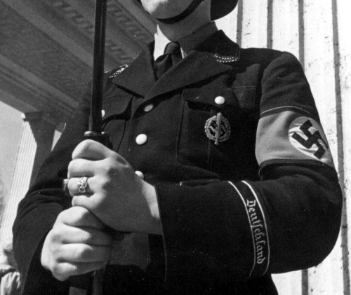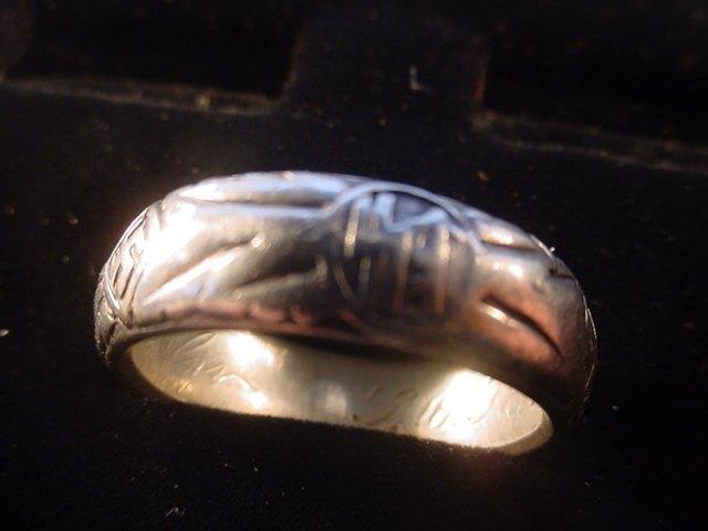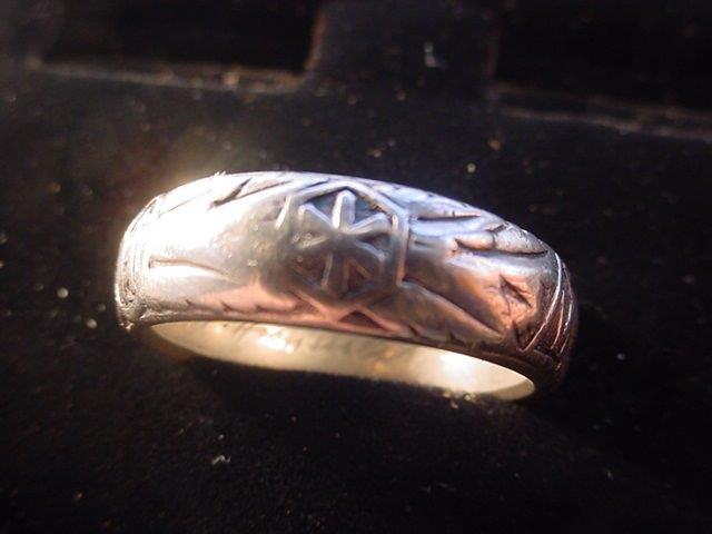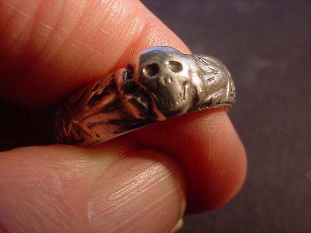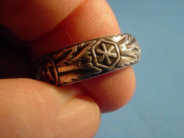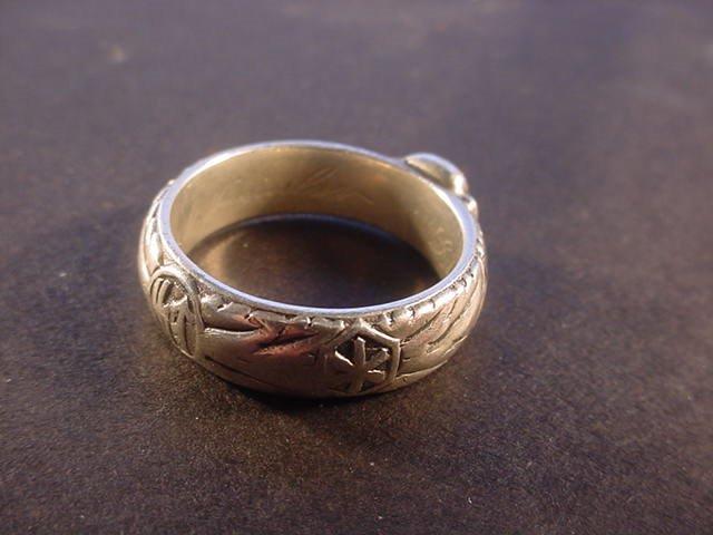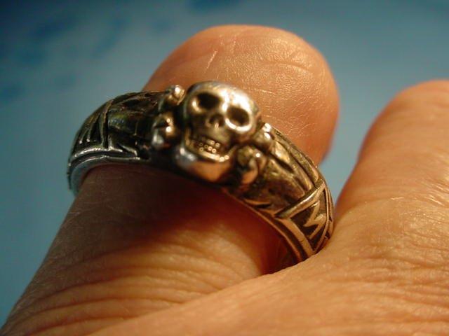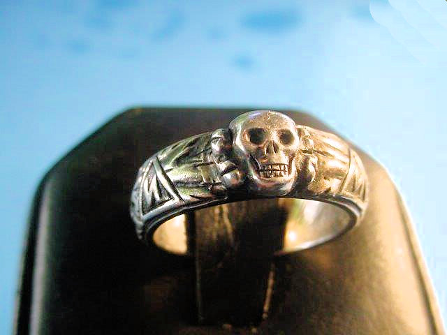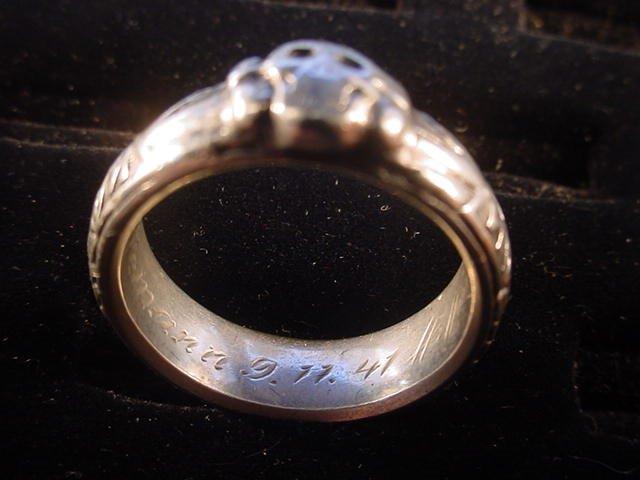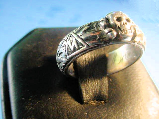 DESCRIPTION: Here is possibly the rarest and most important ring we have ever had. It is the double-link ring that features the side-by-side links that are reminiscent of the style used in the chain links of the SS dagger suspension of a 1936 chained SS dagger as designed by Professor Karl Diebitsch. This amazingly talented artist extraordinaire was the original designer of the black SS uniform, various postage stamps, many SS crests, great paintings, SS swords, wonderful tapestries, and many other SS-oriented items. Diebitsch carried the rank of SS-Oberf�hrer. He served during the war years in the SS-Totenkopf division, SS-Germania, and SS-Wiking. He was promoted to SS-Oberf�hrer 20 April 1944 (Hitler�s birthday). The fact that he designed this ring is pretty much assured.