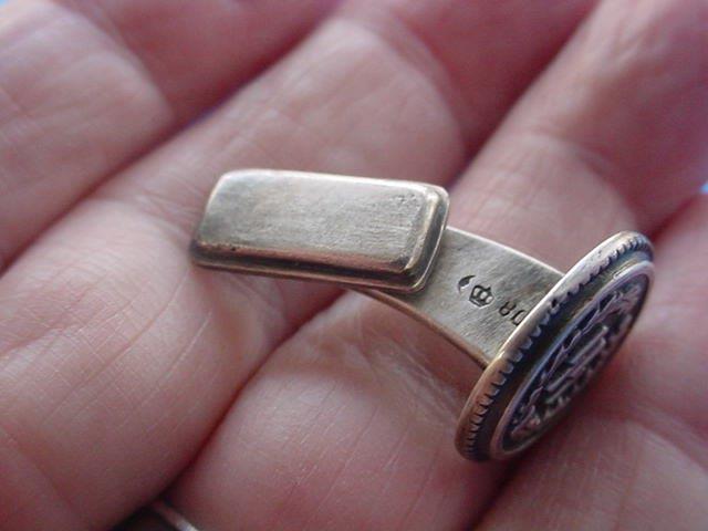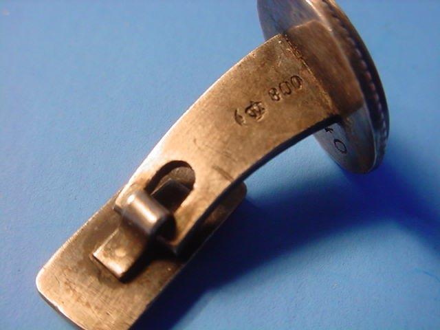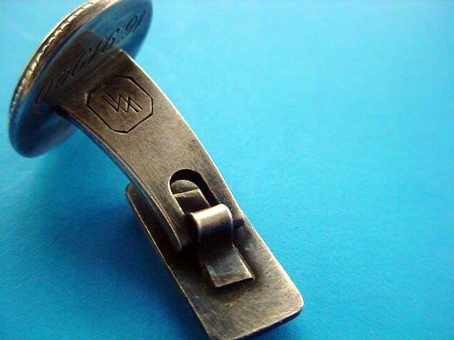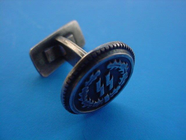 These links have the runic symbols in the middle of a circular grouping of oak leaves. They are marked underneath with the double-twisted runic symbol that was the hallmark of Professor Carl Diebitsch, who was the artist that designed them. On the other side, they bear the half moon, the crown, and the silver designation �800.� Underneath the main roundel on the back is the hand-engraved date of birth the recipient. In this case, September 16, 1940. These cufflinks were always personally gifted by the Reichsf�hrer-